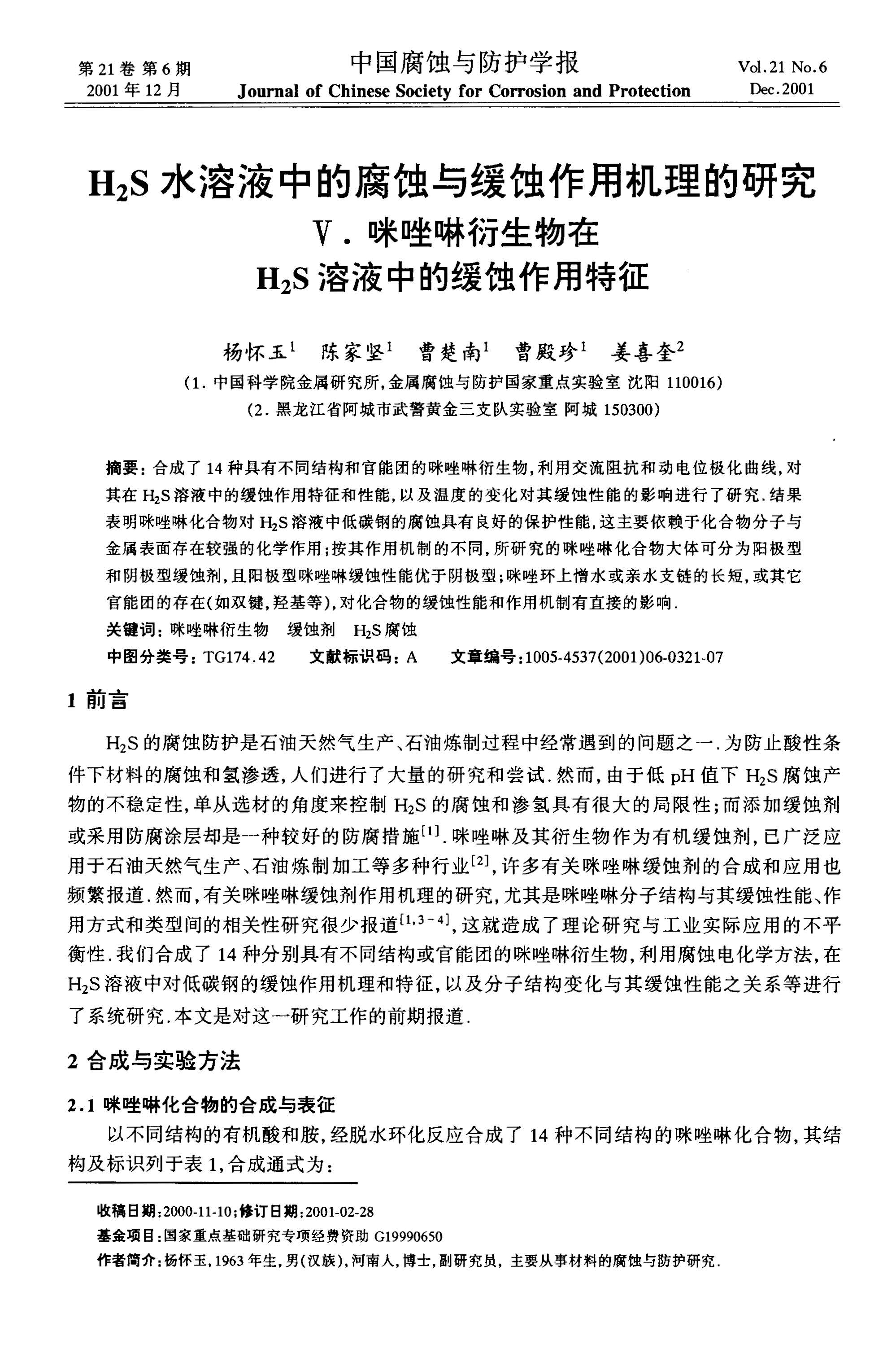 H2S水溶液中的腐蚀与缓蚀作用机理的研究 V.咪唑啉衍生物在H2S溶液中的缓蚀作用特征