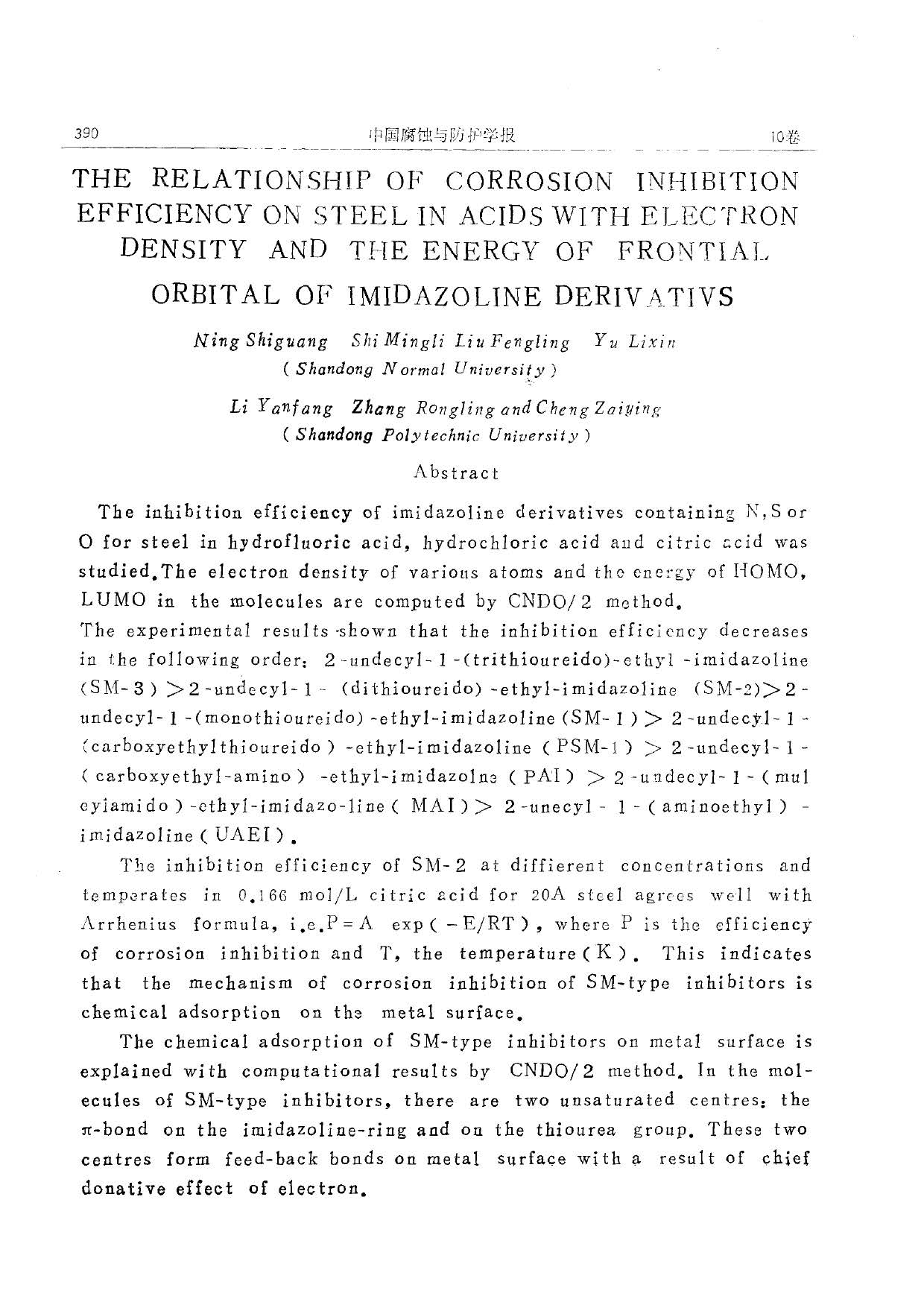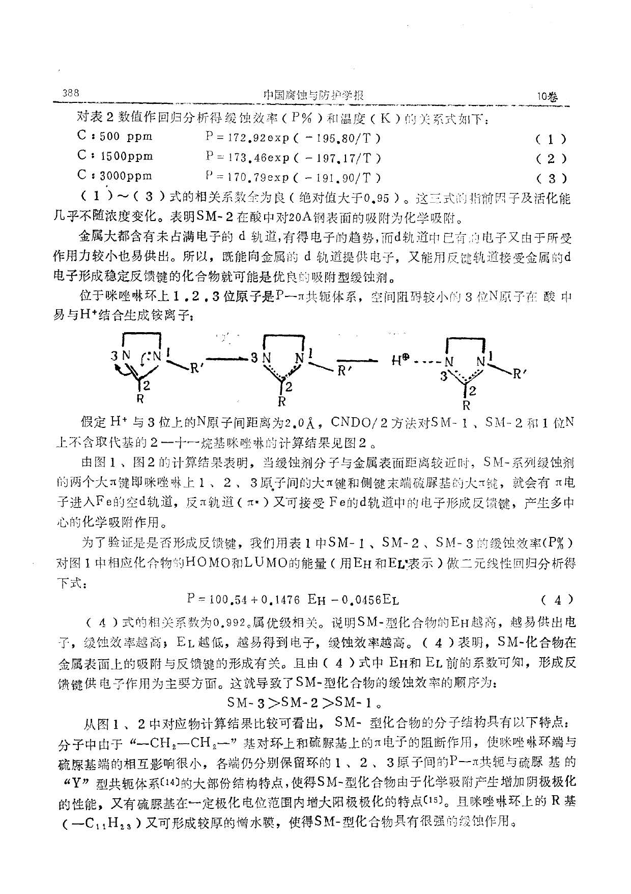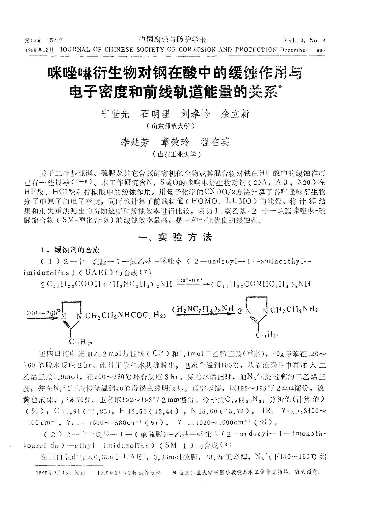 咪唑咻衍生物对钢在酸中的缓蚀作用与电子密度和前线轨道能量的关系