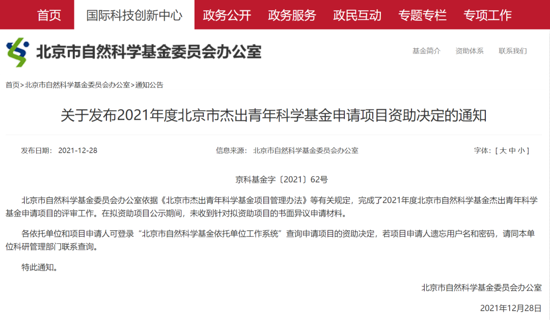 今日,北京科委发布了《关于发布2021年度北京市杰出青年科学基金申请项目资助决定的通知》,通知称在拟资助项目公示期间,未收到针对拟资助项目的书面异议申请材料。11月23日,北京科委公布了《2021年北京市杰出青年科学基金项目拟资助项目公告》,根据通知,该公告名单即为最终资助名单。