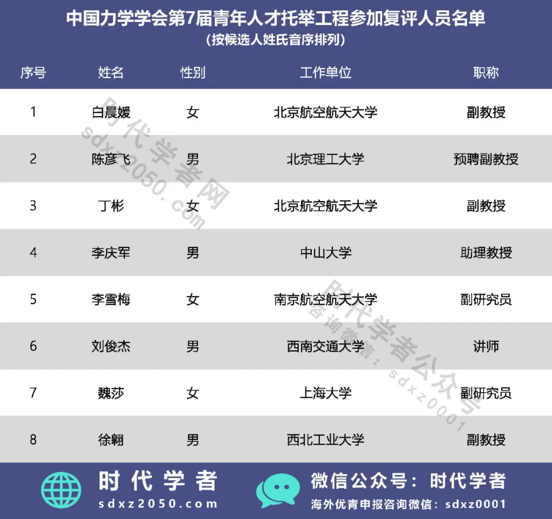 按照中国科协《青年人才托举项目实施方案》有关要求,中国力学学会自2021年10月16日组织开展第7届“青年人才托举工程”候选人选拔工作。截止2021年11月10日,共收到62位有效候选人的推荐表。根据《中国力学学会青年人才托举管理办法》,经过网络初评,遴选出参加复评的8名候选人。