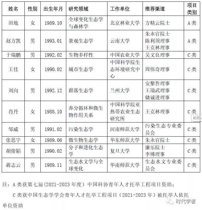 根据《中国科协办公厅关于公布第七届中国科协青年人才托举工程项目立项结果的通知》、《中国科协青年人才托举工程管理办法》、《中国科协青年人才托举工程实施管理细则》、《中国生态学学会青年人才托举工程管理办法》和《中国生态学学会青年人才托举工程实施细则》有关规定和要求,经学会分支机构、专家(院士、学会理事)推荐和青年科技工作者自荐,项目工作组资格审查和初选,遴选专家组无记名打分、投票,最终遴选出中国生态学学会青年人才托举工程项目(2021-2023年)资助人选10名,其中2名入选中国生态学学会青年人才托举工程(2021-2023年)项目A类并作为第七届(2021-2023年度)中国科协青年人才托举工程项目被托举人推荐人选,8名入选中国生态学学会青年人才托举工程(2021-2023年度)项目C类,现将有关被托举人基本信息和遴选专家信息予以公示。