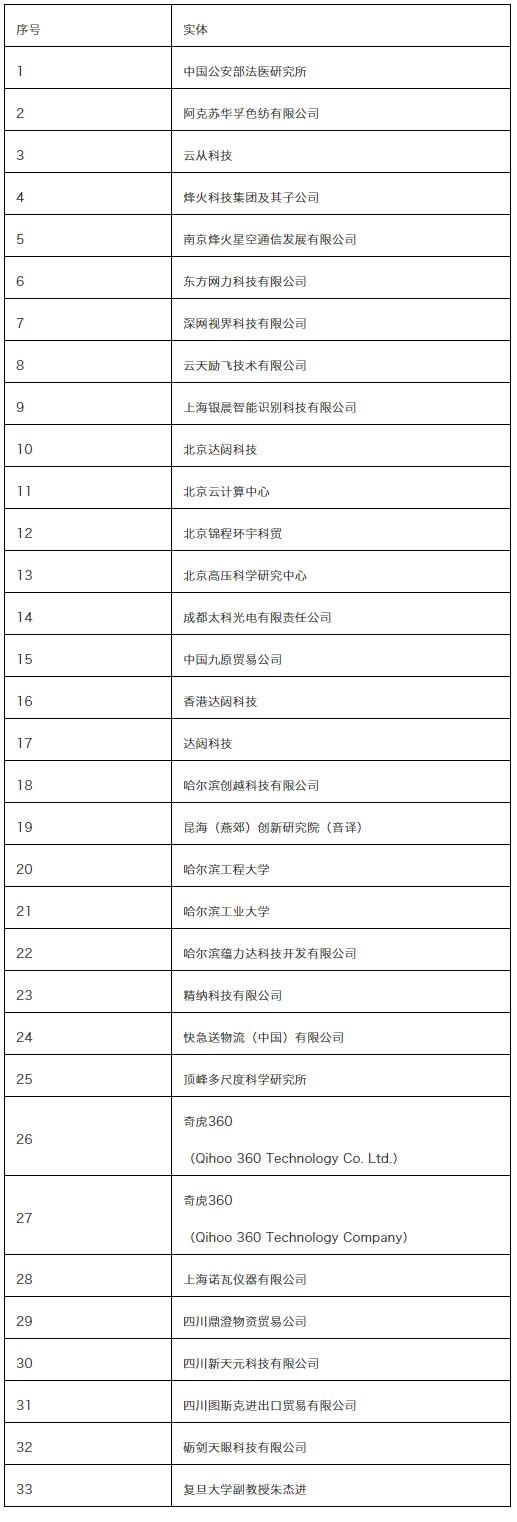 美国商务部将28家中国的机构和公司列入了美国出口管制”实体名单“。