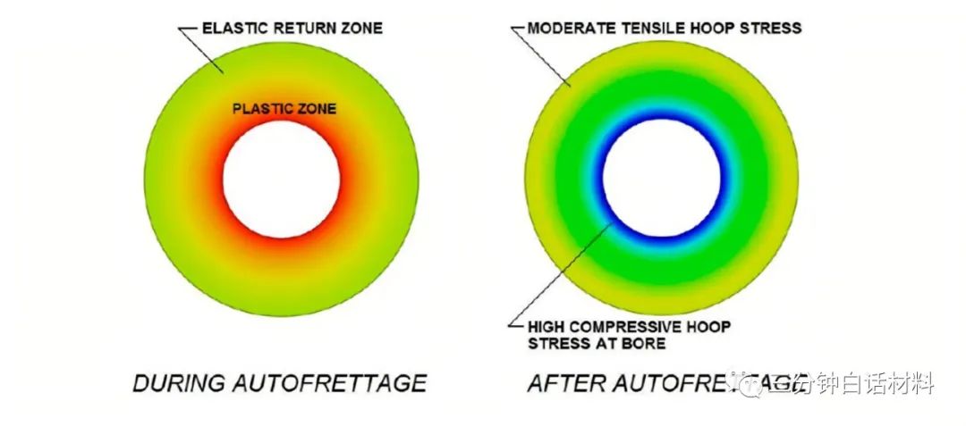 那么我们会想到新的问题,人多真的就没用了么?当然不是,对于炮管有一种技术叫身管自紧技术,可以让外壁材料贡献更多的力量。通过机械或液压的方法对其膛内施以高压,那么通过前述介绍我们知道炮管壁内部受力大,而外部受力小,而所加的力掌握在使内壁产生塑性变形(图中Plastic Zone 区域)不开裂,但使外壁保留一部分在弹性变形范围(图中Elastic Return Zone区域)。这里解释一下当材料受力由小到大,先是产生弹性变形,就像橡皮筋一样弹性变形不是永久的变形泄力后会恢复,当力再增加就会产生塑性变形,塑性变形是永久变形,再增加力就会拉断。这样当自紧过程结束后,内壁由于产生的是塑性变形比初始时增大了,而外壁产生的是弹性变形要恢复初始大小但内壁变大了不让外壁恢复,这样炮管内壁产生残余压应力(High compressive hoop stress),外壁产生残余拉应力(Moderate tensile hoop stress)。