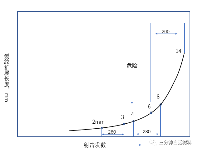 断裂力学研究炮钢裂纹的发生、扩展过程,并且重要的是确定裂纹扩展安全门槛值,裂纹超过安全门槛值前是可控,即在每一次炮弹的发射会稍微扩展,但不会自动像玻璃一样一裂到底,而一旦超过门槛值,裂纹就会变为自动扩展直到完全断裂。所以铁匠铺可以打个大门栅栏镰刀斧头之类的冷兵器时代的用品,但对于现代武器必须是建立在高科技积累之上的。图6为裂纹发生、扩展和门槛值的示意图。