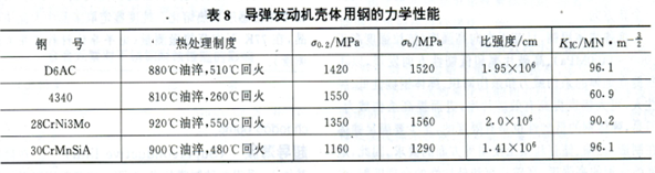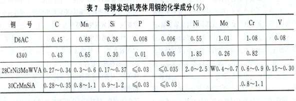 为减轻导弹弹体的重量,要求壳体用钢应具有高的比强度,以增大火箭的推力;为防止低应力破坏,要求壳体用钢应具有高的断裂韧性;为降低制造成本,要求壳体用钢应具有良好的加工性能和焊接性能。