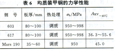 在战争中装甲钢将受到不同距离、口径、速度的各种弹丸的冲击与爆炸物的轰击,瞬间承受巨大的动能、破片、冲击波和聚能效应,使装甲钢在高温、高压和高速作用下发生塑性变形、破裂、甚至部分熔化或气化。因此要求装甲钢具有良好的抗弹性能。装甲钢的抗弹性能主要是指其抗弹丸的侵彻能力、抗冲击能力和抗崩落能力。抗侵彻能力是指在一定装甲厚度和弹丸着角的条件下,装甲钢不被击穿的最大动能弹着速或能抵御某种标准破甲弹的能力。一般认为它随着装甲材料的硬度和弹性模量的提高而提高。抗冲能力是指在弹丸的高速冲击下,装甲不发生开裂和崩落等损伤的能力。它与材料的韧性和强度有关。所以要求装甲钢具有良好的抗侵彻、抗冲击和抗崩落等能力,即要求装甲钢应具有高强度和良好的韧性,以提高钢的抗弹性能。在制造装甲车辆的过程中,还要求装甲钢具有良好的冷热加工性能和焊接性能。典型的均质装甲钢的化学成分和力学性能列于表5和表6。