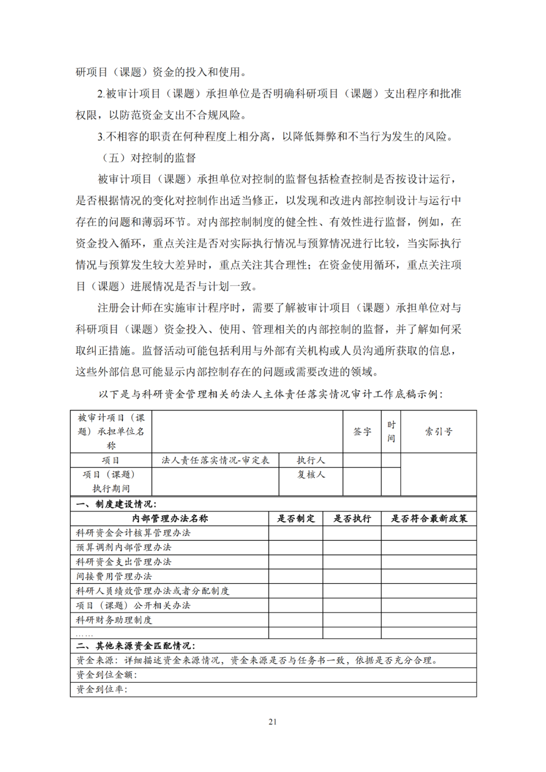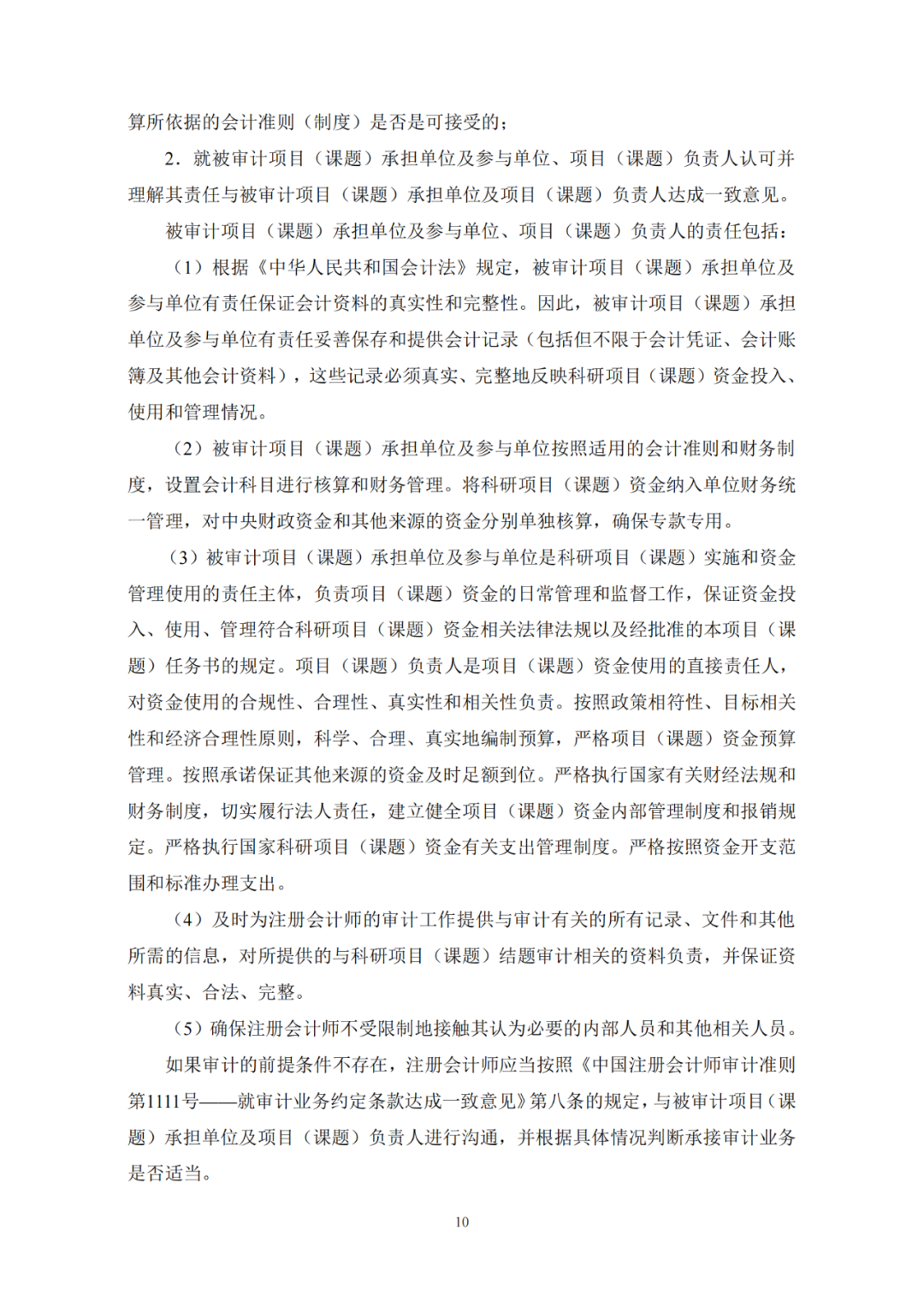 2. 根据国办发〔2021〕32 号文关于“全面落实科研财务助理制度”、“强化项目承担单位法人责任”的相关要求,征求意见稿要求注册会计师了解并在审计报告中披露科研财务助理制度落实情况、法人主体责任落实情况。