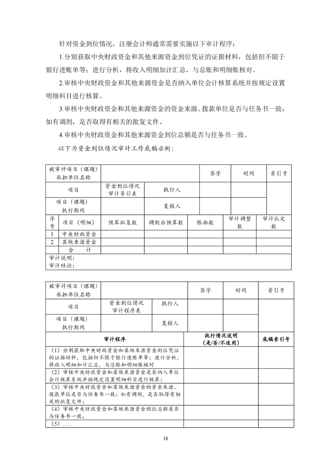 1. 围绕审计目标和审计报告要求,结合近年来审计实务中的问题,征求意见稿对“计划审计工作”、“风险评估”和“控制测试”三章中注册会计师需要考虑的事项和执行的程序进行了补充,并将“实质性程序”一章重新划分为资金到位情况、资金拨付情况、资金支出情况、应付未付支出和预支出情况四个方面,分别对注册会计师需要实施的审计程序进行举例。