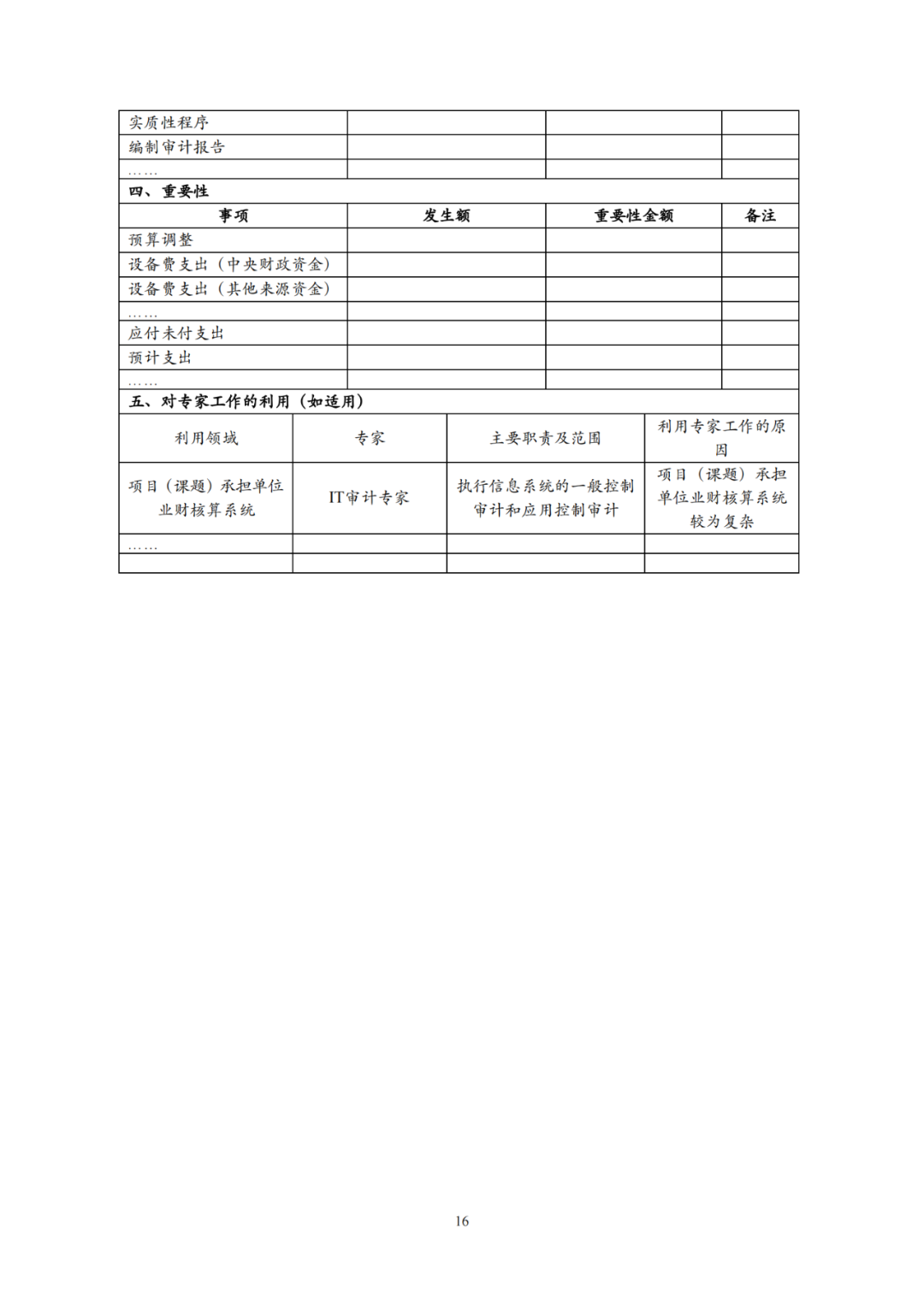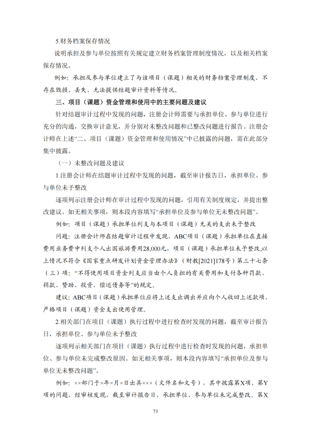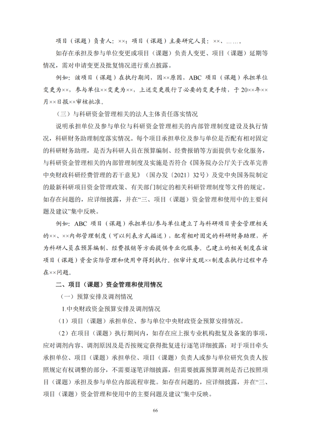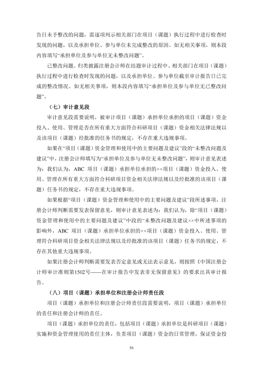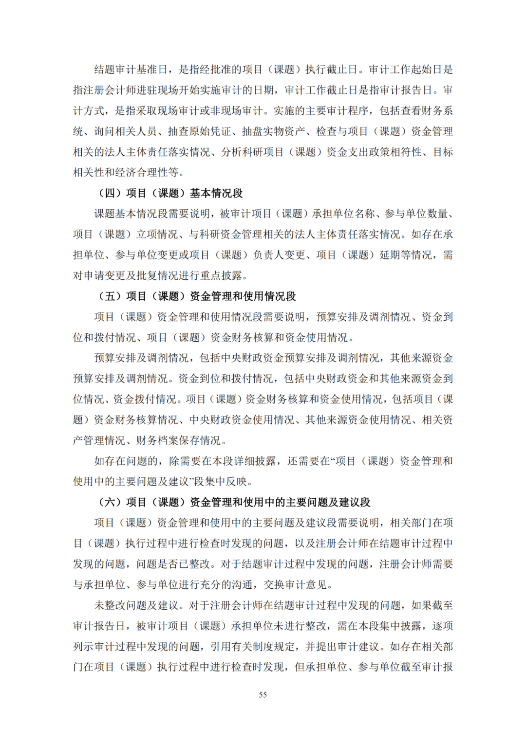 1. 优化了审计报告的正文结构和内容。征求意见稿在“引言段”新增了披露审计工作起始日、审计方式、实施的主要审计程序等信息的要求;在“课题基本情况段”中简化了已在相关技术报告或项目(课题)任务书中披露的内容,如项目(课题)承担单位介绍、课题研究内容等;在“资金管理和使用情况段”要求按照预算安排及调剂情况、资金到位和拨付情况、项目(课题)资金财务核算和资金使用情况分别进行报告,充分体现放宽预算管理权限和落实法人主体责任的政策,对于单位和负责人有权调剂预算的,不需要逐笔详细披露,但要求详细披露存在的问题;在“资金管理和使用中的主要问题及建议段”中要求披露相关部门在项目(课题)执行过程中进行检查时发现的问题、注册会计师在结题审计过程中发现的问题,以及问题是否已整改;简化了有关项目(课题)承担单位的责任和注册会计师的责任的表述。