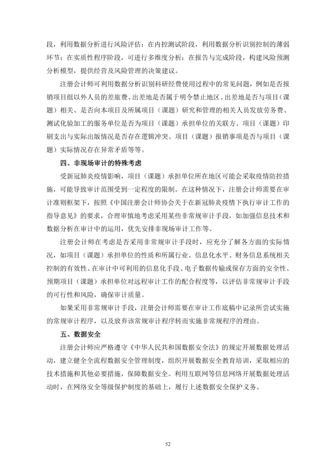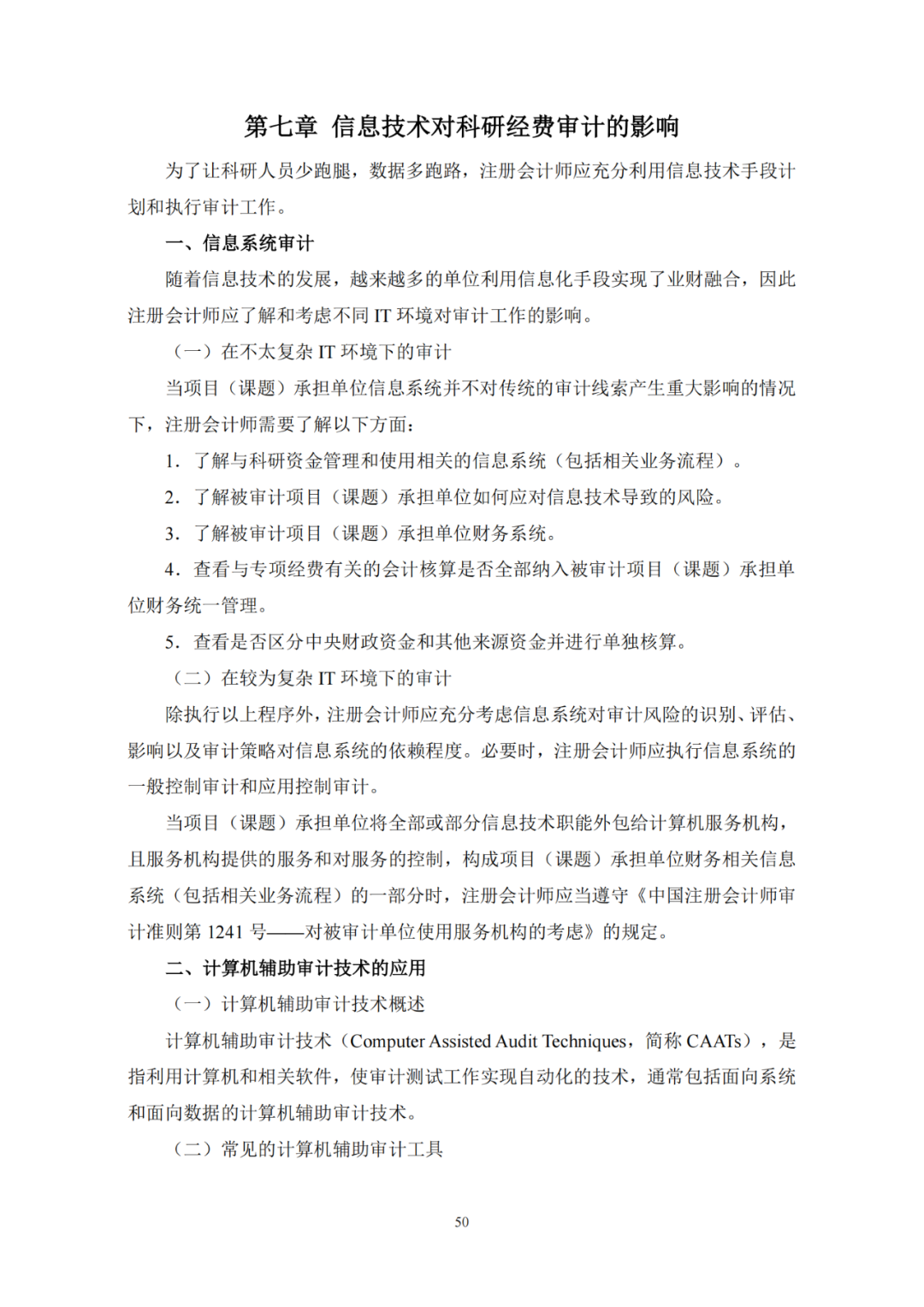 2. 针对项目(课题)承担单位信息化管理日益普及和审计数字化转型的现实情况,征求意见稿新增了“信息技术对 科研经费审计的影响”一章,提出了注册会计师分别在不太 复杂和较为复杂IT 环境下执行审计业务时需要考虑的事项,对在审计过程中应用数据分析技术作出了解释和说明。同时,征求意见稿还强调了注册会计师在采用非常规审计手段时需要考虑的事项。