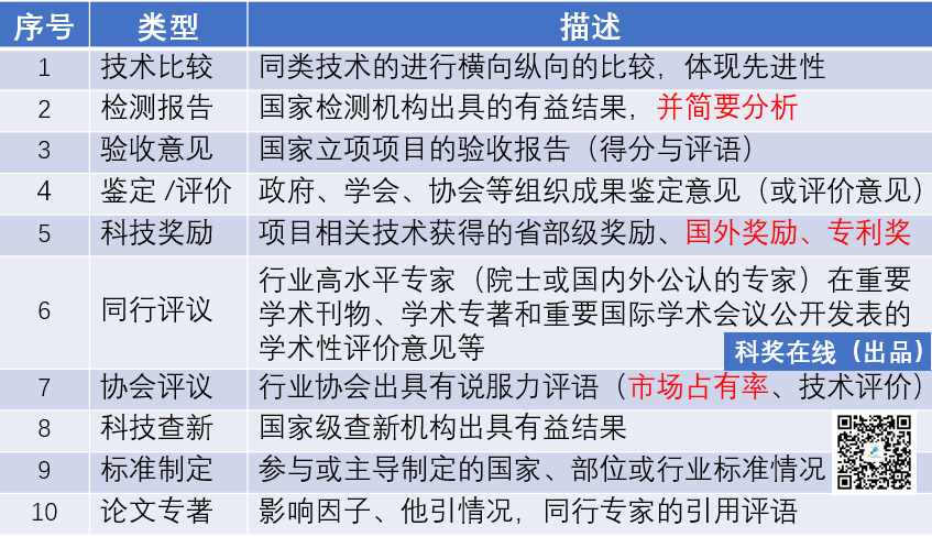通过第三者角度客观、真实、准确评价项目的首创性、先进性和技术价值,从历年的国家奖申报素材看,可选择素材有很多(如下),特别说明的是,自然奖、发明奖、进步奖的客观评价素材没有明显界限,可以混用。