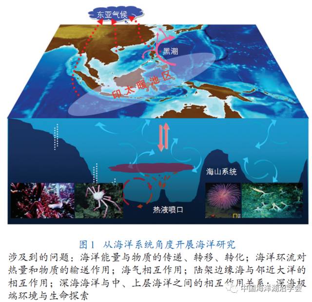 海洋科学具有大科学的特点,陆地上有的过程海洋中几乎都有;海洋学科也非常复杂,物理、化学、生物、地质无所不包,海岸带、近海、大洋、深海都很重要。但是从另一个角度看问题,不仅海洋各个部分是连在一起的,海洋各个学科也是相互关联的,例如海洋生态学的研究中,物理、化学、生物和地质环境缺一不可,所以海洋科学研究是物理海洋学、化学海洋学和生物海洋学以及海洋地质学的综合体现。我们是否能够把这几个学科结合在一起,围绕同一个问题、在同一个平台上开展研究?是否能够将大洋、深海和近海联系在一起,形成一个有机整体开展综合系统研究?什么样的题目能够表达这样的综合研究?在中科院海洋先导专项的设计中我们进行了有益的探索(图 1和图 2)。