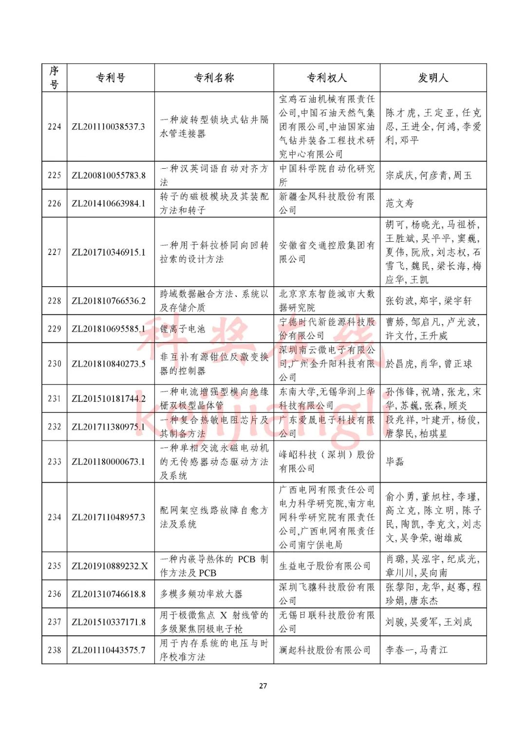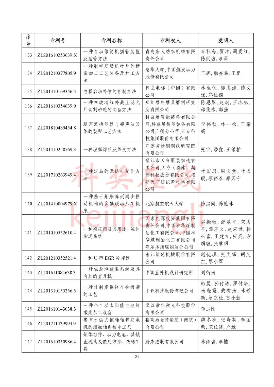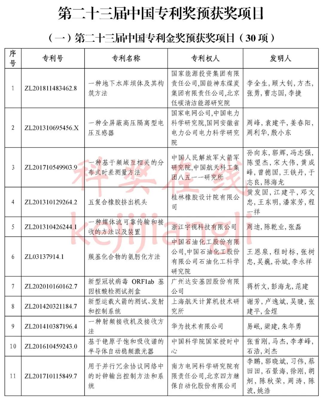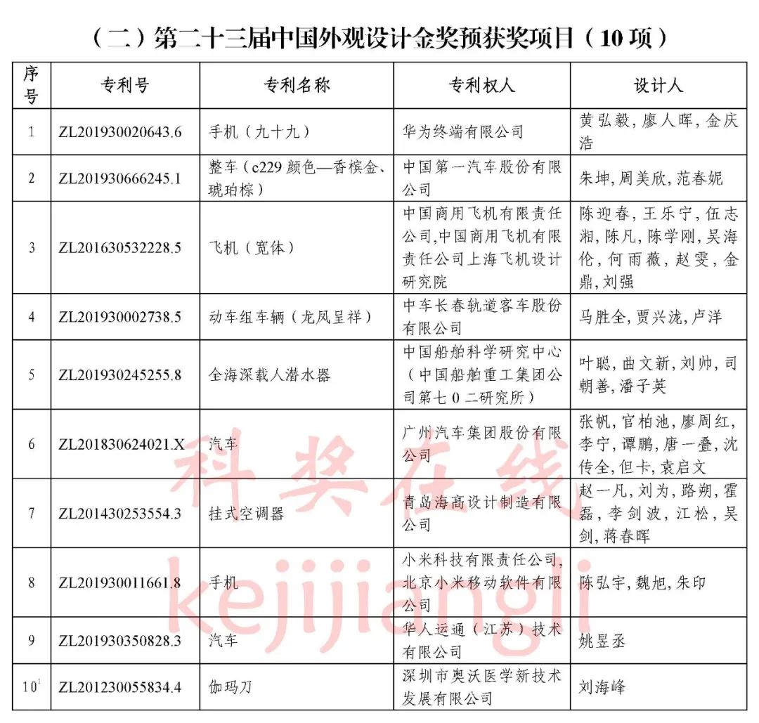 根据《中国专利奖评奖办法》《国家知识产权局关于评选第二十三届中国专利奖的通知》规定,第二十三届中国专利奖共评选出:中国专利金奖预获奖项目30项,中国外观设计金奖预获奖项目10项,中国专利银奖预获奖项目60项,中国外观设计银奖预获奖项目15项,中国专利优秀奖预获奖项目792项,中国外观设计优秀奖预获奖项目52项,现予以公示,公示期为2022年4月15日至4月21日。