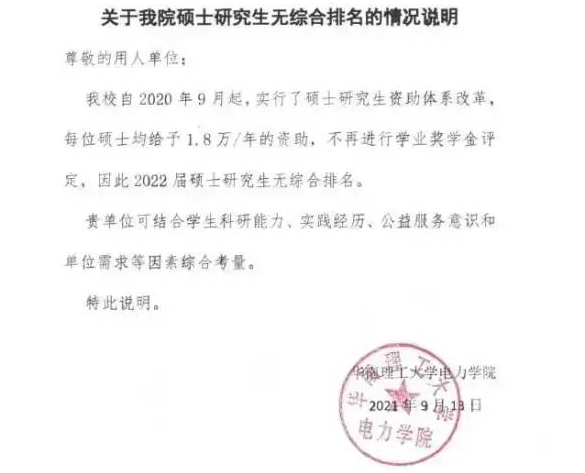 经过小募检索发现,华南理工大学电力学院曾于2021年9月发布过《关于我院硕士研究生无综合排名的情况说明》,其中明确表示: