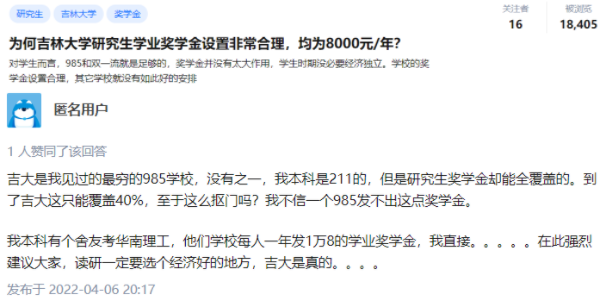 近日,知乎一则问题“为何吉林大学研究生学业奖学金设置非常合理,均为8000元/年?”引发关注!网友质疑985高校,研究生奖学金仅覆盖40%且一年8000元的标准,真的算合理吗?