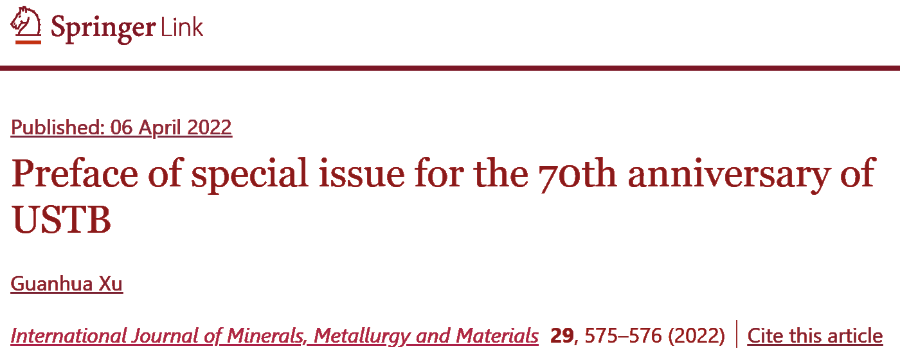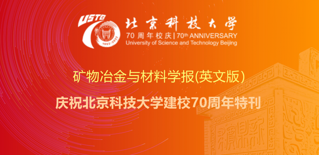 为了隆重庆祝北京科技大学建校70周年,《矿物冶金与材料学报(英文版)》组织出版了“庆祝北京科技大学建校70 周年特刊”,邀请了全球矿物、冶金、材料行业院士/高水平学者就相关领域的发展前沿、研究现状、技术挑战、创新成果与未来展望进行研究和综述。中国科学院院士徐冠华教授为特刊作序。特刊包括论文28篇,其中17篇综述类论文,11篇原始研究论文;11篇来自于国内外院士团队,8篇来自于日本、英国、美国、比利时、瑞典的院士团队和国际著名学者,11篇来自国内著名学者。这些论文全方位、立体化展现了碳中和与碳达峰、机器学习、腐蚀大数据、智能矿冶技术、纳米气泡浮选、绿色与可持续冶金、先进金属材料、功能材料和新型能源材料等前沿领域的科技创新的重要成就和重大进展,与广大的科研工作者、期刊的读者和作者们共同见证北京科技大学70年从成长到壮大的辉煌历程。