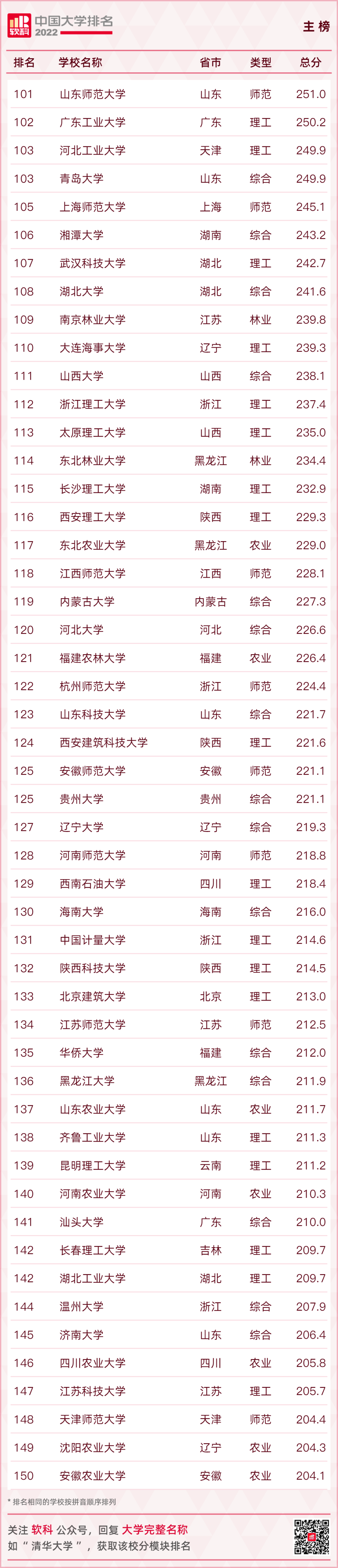 2022软科中国大学排名遵循分类排名的原则,对单科性大学(医药类、财经类、语言类、政法类、民族类、体育类)使用差异化指标体系分别进行排名。在每一类型的排名中,参与排名计算的不仅有本类型的大学,也包括综合性大学和所有其它类型的单科性大学。