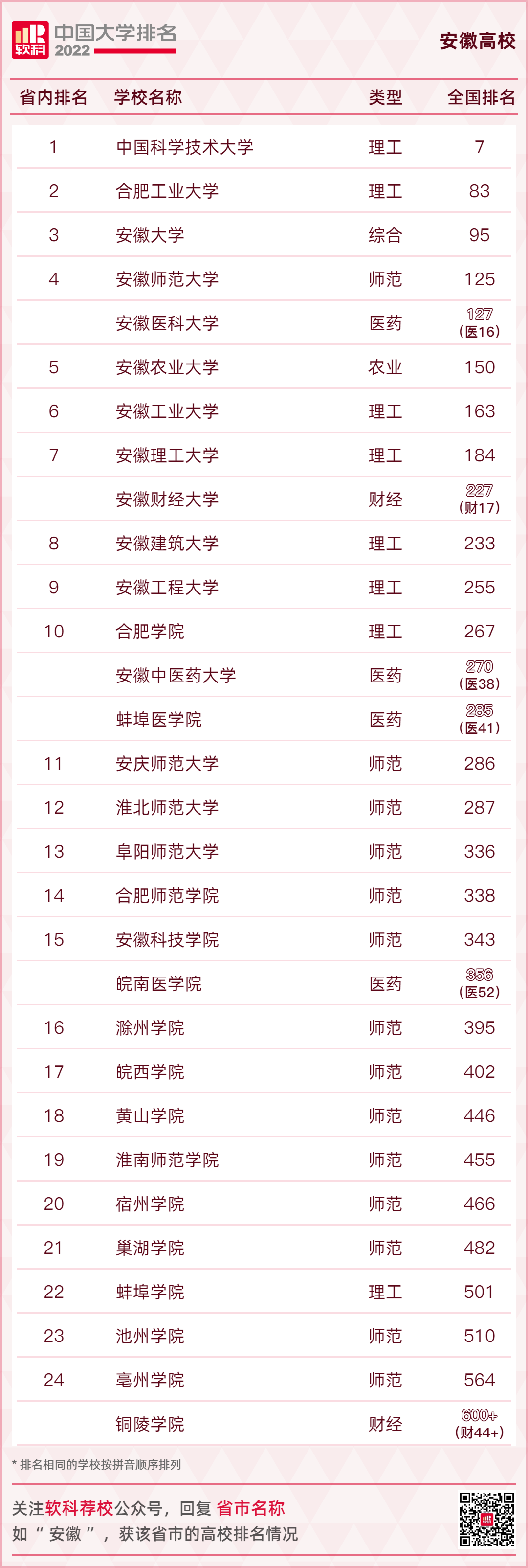 以下为安徽省高校的整体排名情况。