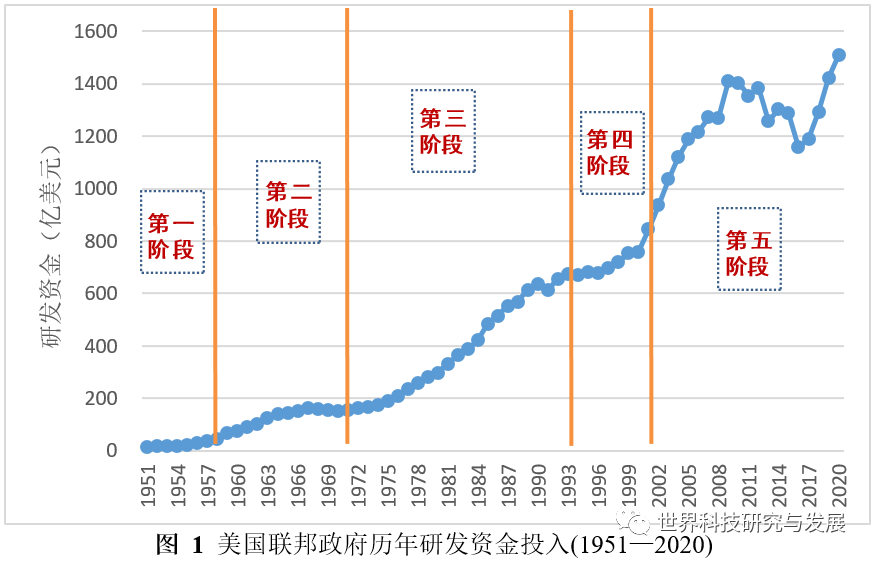 第一阶段(二战后至1965年),由于二战期间美国在科技上的巨额投入对美国及其盟军赢得胜利发挥了重要作用,二战结束后,罗斯福总统的科技顾问范内瓦·布什向其提交《科学:无尽的前沿》报告,提出美国政府的优先任务是创造新知识,以造福美国社会各界。在这一科技政策的指导下,美国先后成立了美国国家科学基金会、国家航空航天局等机构,并启动了阿波罗计划等,这些政策和措施大大促进了美国联邦研发资金投入的增长,1951年,美国联邦研发资金为15亿美元,1965年增至146亿美元,增加了近9倍。