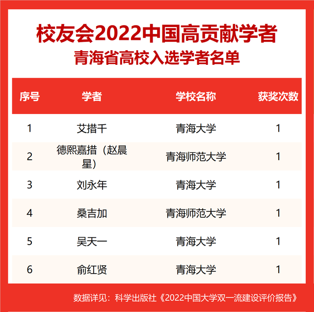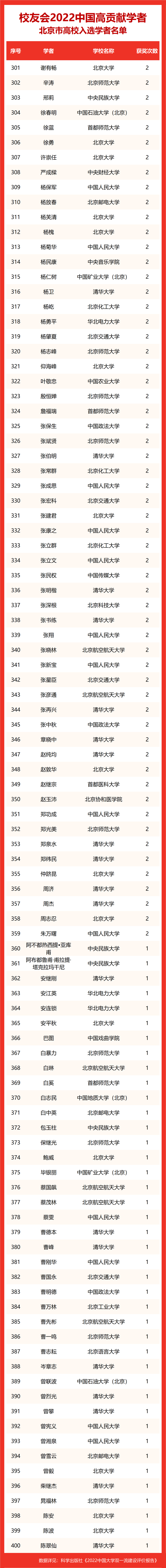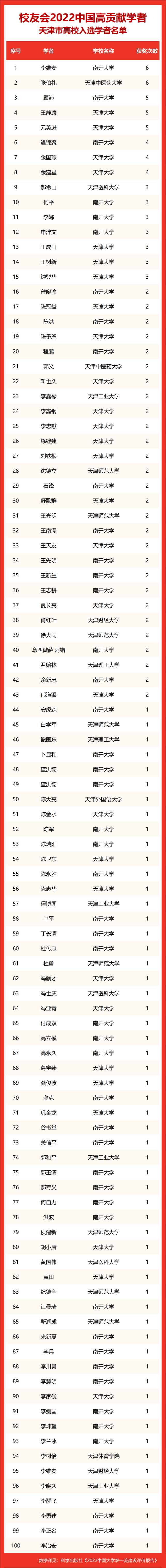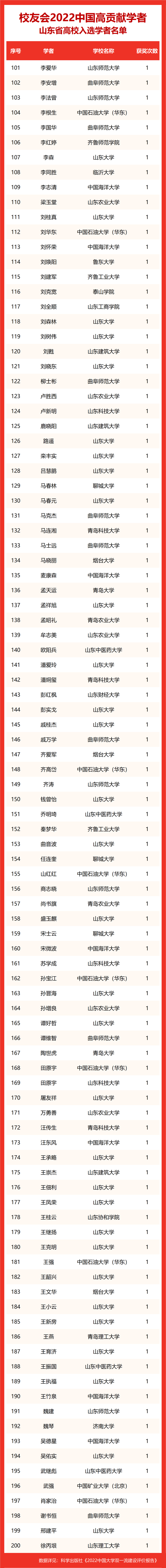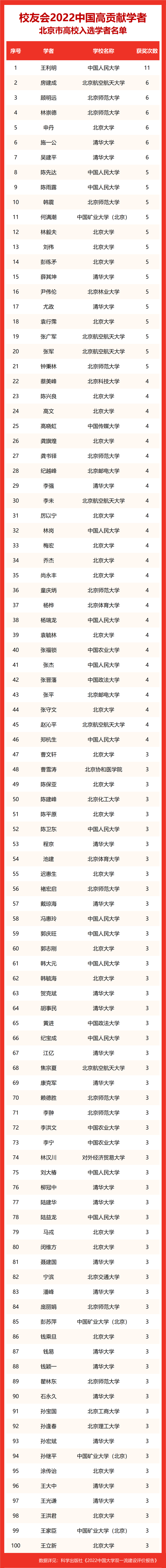 校友会2022中国高贡献学者遴选突出评价学者的教育教学水平、学术研究水平、创新质量和实际社会贡献,选择国家教学成果奖、国家科学技术奖励、教育部人文社会科学奖励、中宣部五个一工程奖、中国专利奖等12项社会各界公认权威主流、具有标志性代表性的指标作为评价标准,遴选标准科学客观统一,指标统计时间为2000-2021年。