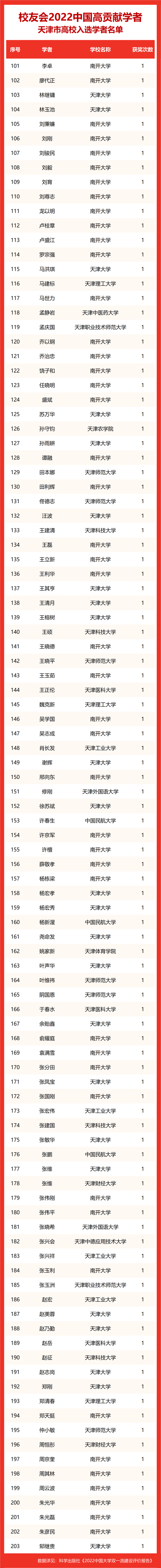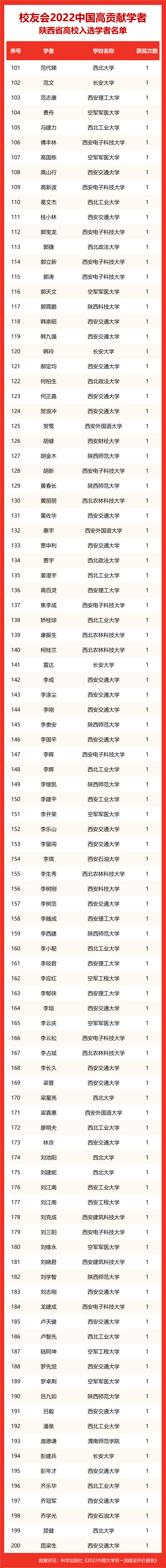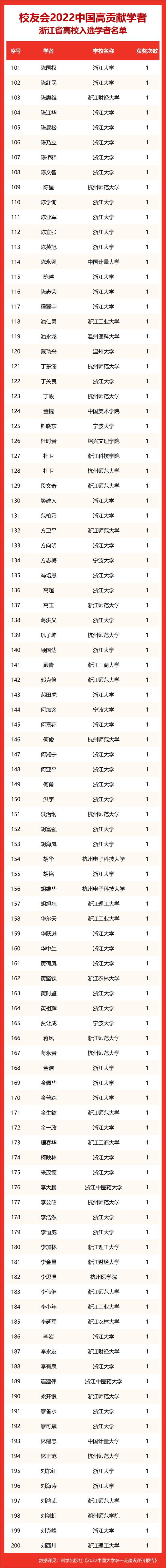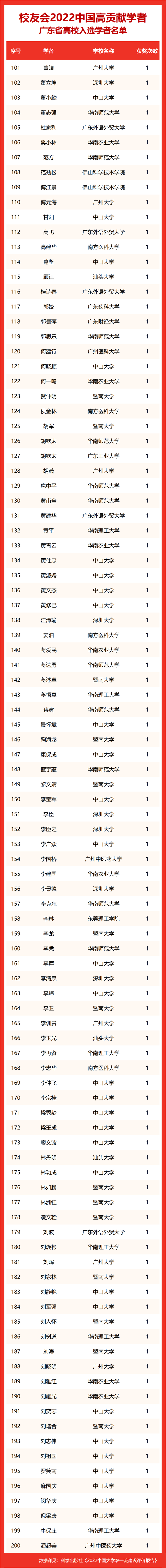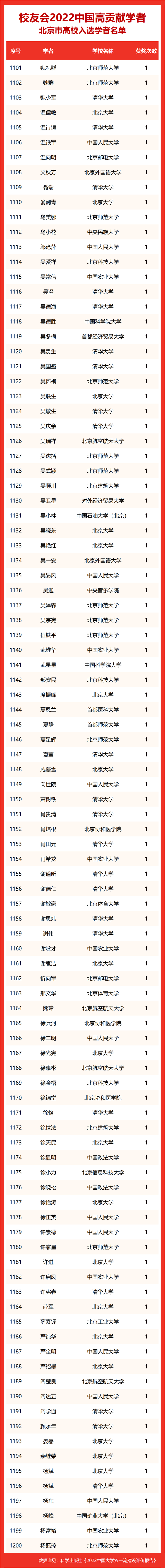 校友会2022中国高贡献学者遴选突出评价学者的教育教学水平、学术研究水平、创新质量和实际社会贡献,选择国家教学成果奖、国家科学技术奖励、教育部人文社会科学奖励、中宣部五个一工程奖、中国专利奖等12项社会各界公认权威主流、具有标志性代表性的指标作为评价标准,遴选标准科学客观统一,指标统计时间为2000-2021年。