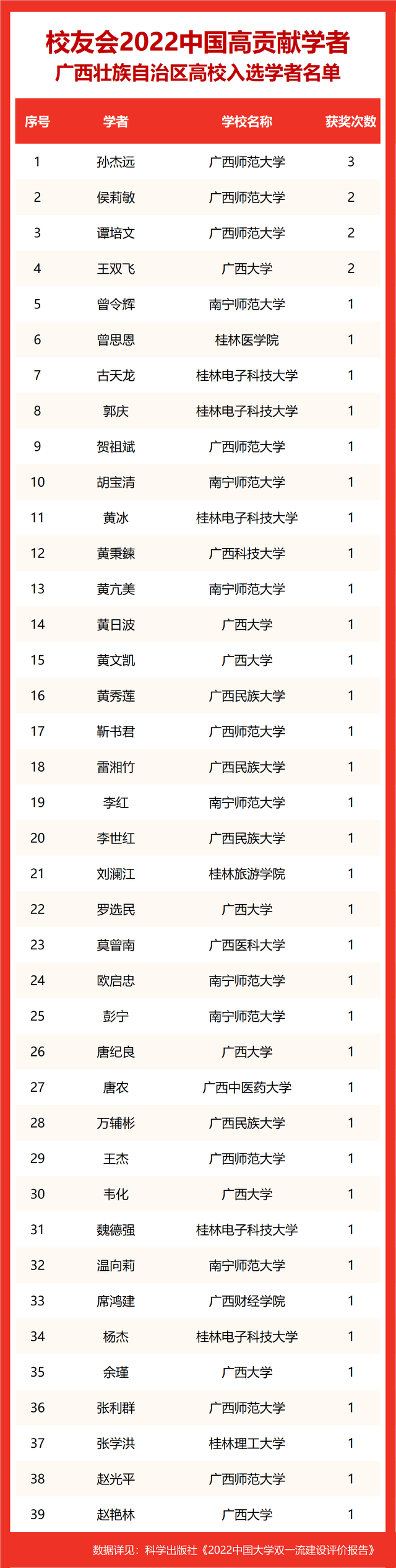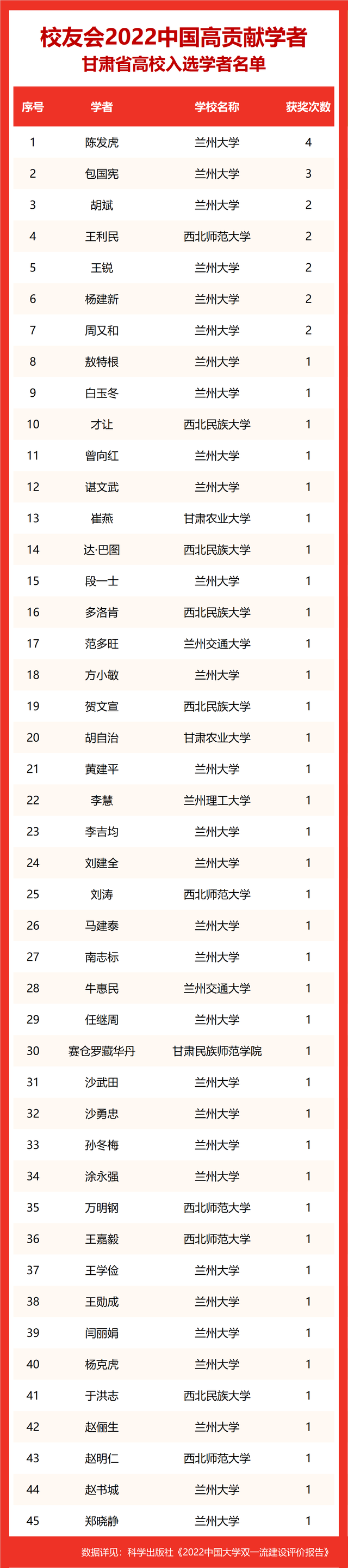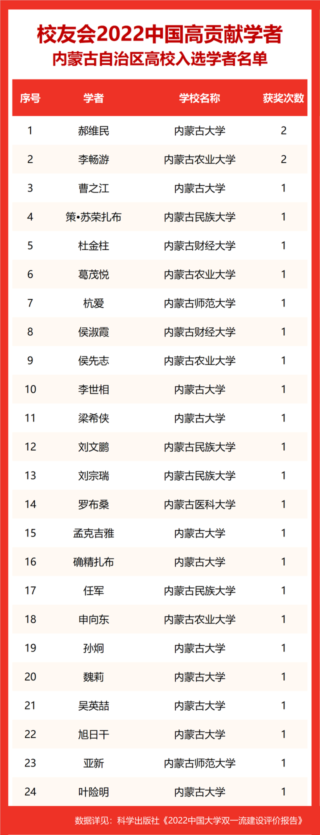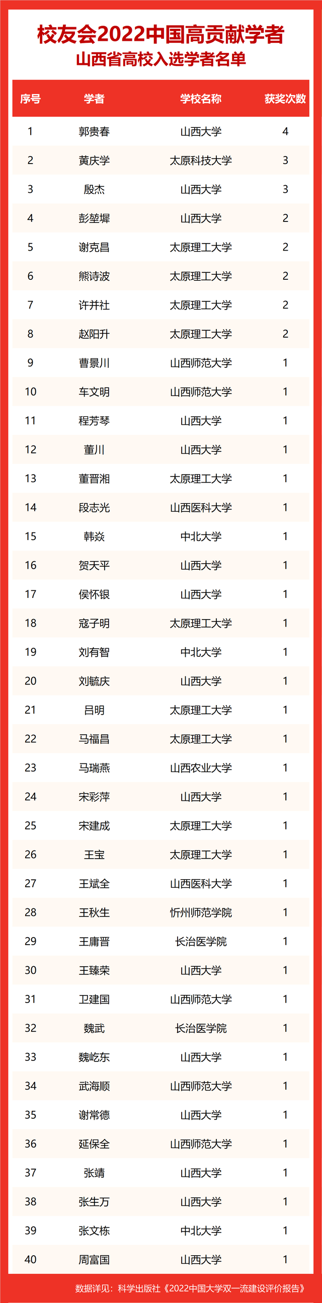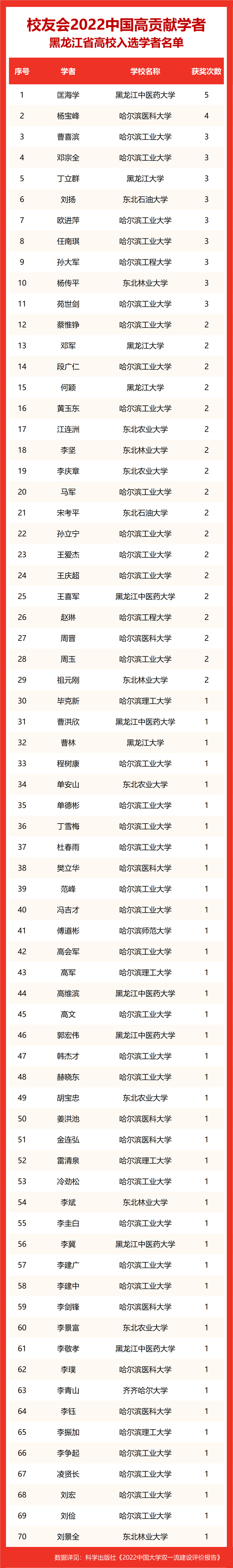 校友会2022中国高贡献学者遴选突出评价学者的教育教学水平、学术研究水平、创新质量和实际社会贡献,选择国家教学成果奖、国家科学技术奖励、教育部人文社会科学奖励、中宣部五个一工程奖、中国专利奖等12项社会各界公认权威主流、具有标志性代表性的指标作为评价标准,遴选标准科学客观统一,指标统计时间为2000-2021年。