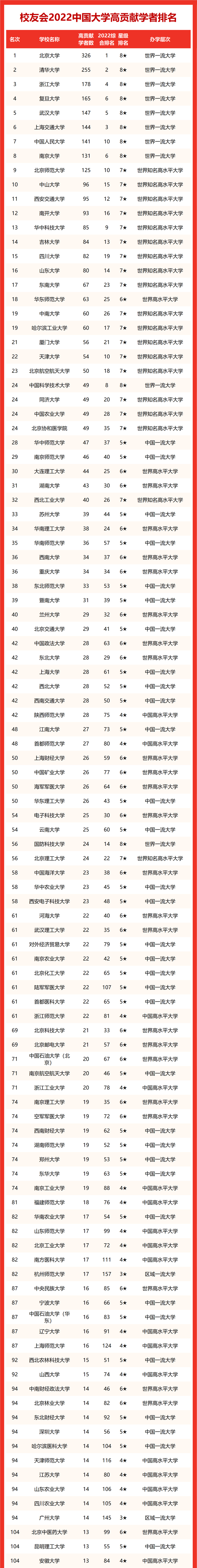 2022中国高贡献学者仅统计全国本科院校的入选学者情况,中国科学院大学、中国社会科学院大学由于办学时间较短,情况特殊,暂未纳入本年度学者的统计范围。令人感到惋惜的是,在入选学者中,部分学者已经过世,但他们为我国高等教育的发展做出了重要贡献。校友会2022中国大学高贡献学者排名如下: