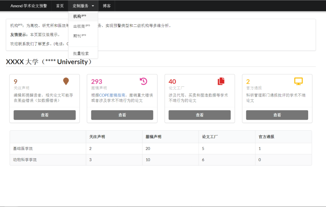 机构pro:为高校、研究所和医院等提供的定制化服务,实现预警类型和二级机构等多维分析。主要提供的信息有以下5类:机构本身的关注声明、撤稿信息、论文工厂、官方通报以及以学院、科室、实验室等为分组依据的信息汇总表。