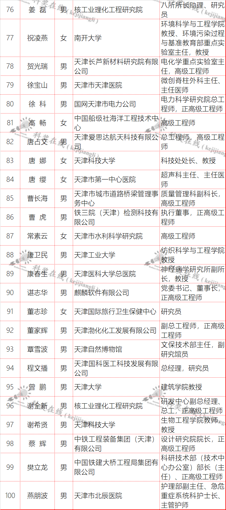 天津市优秀科技工作者标兵、天津市优秀科技工作者拟表彰人选公示