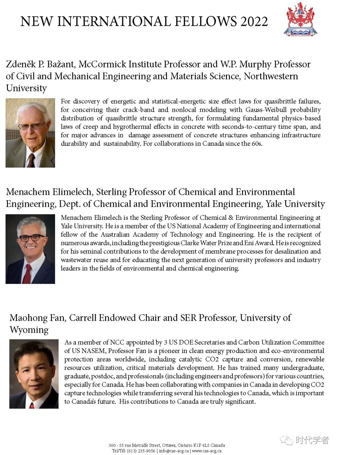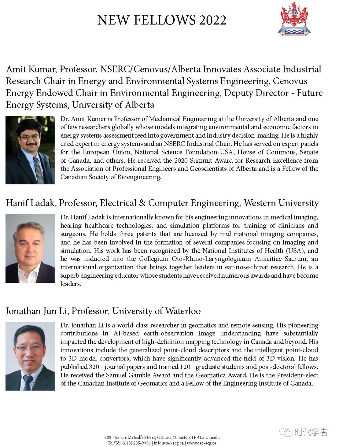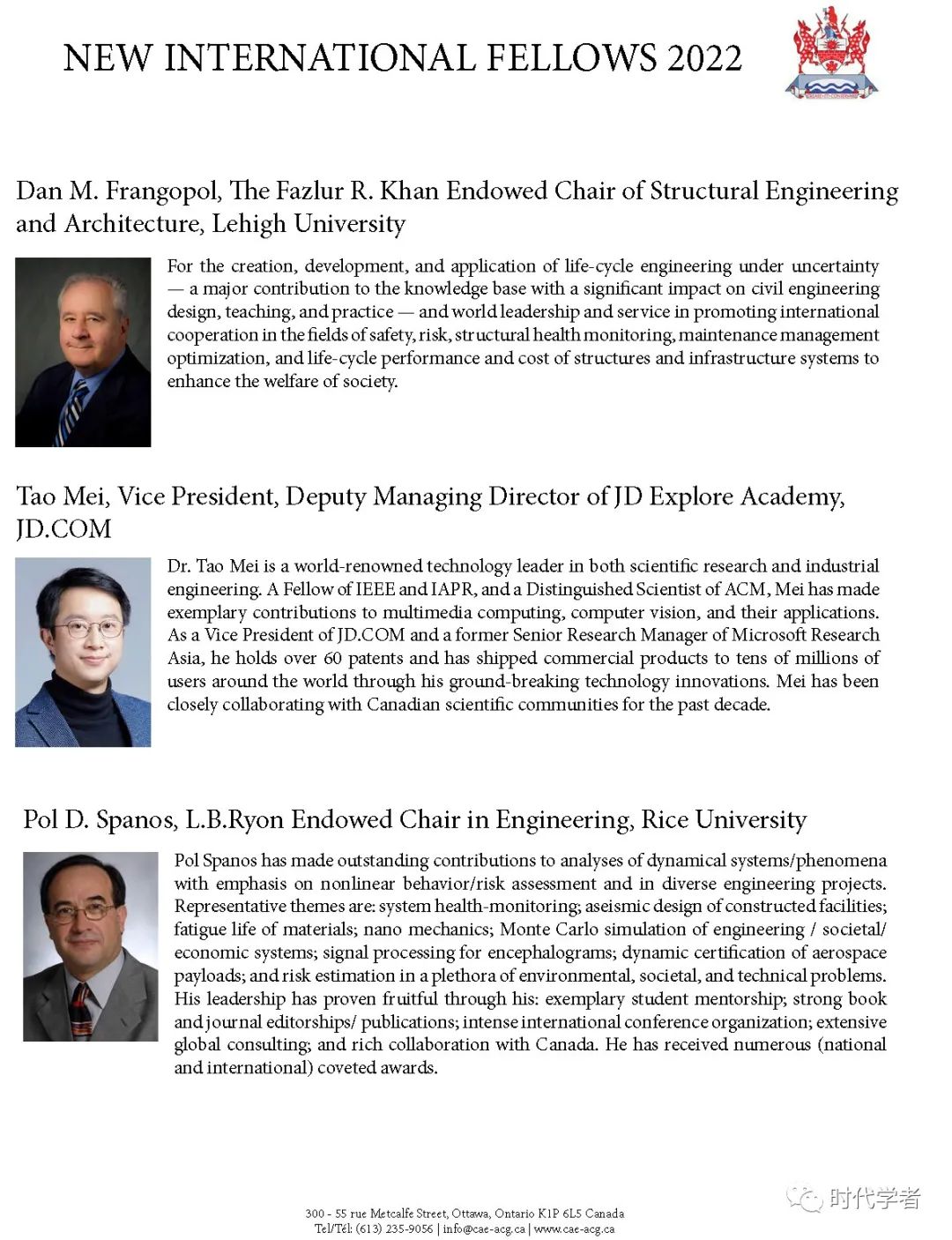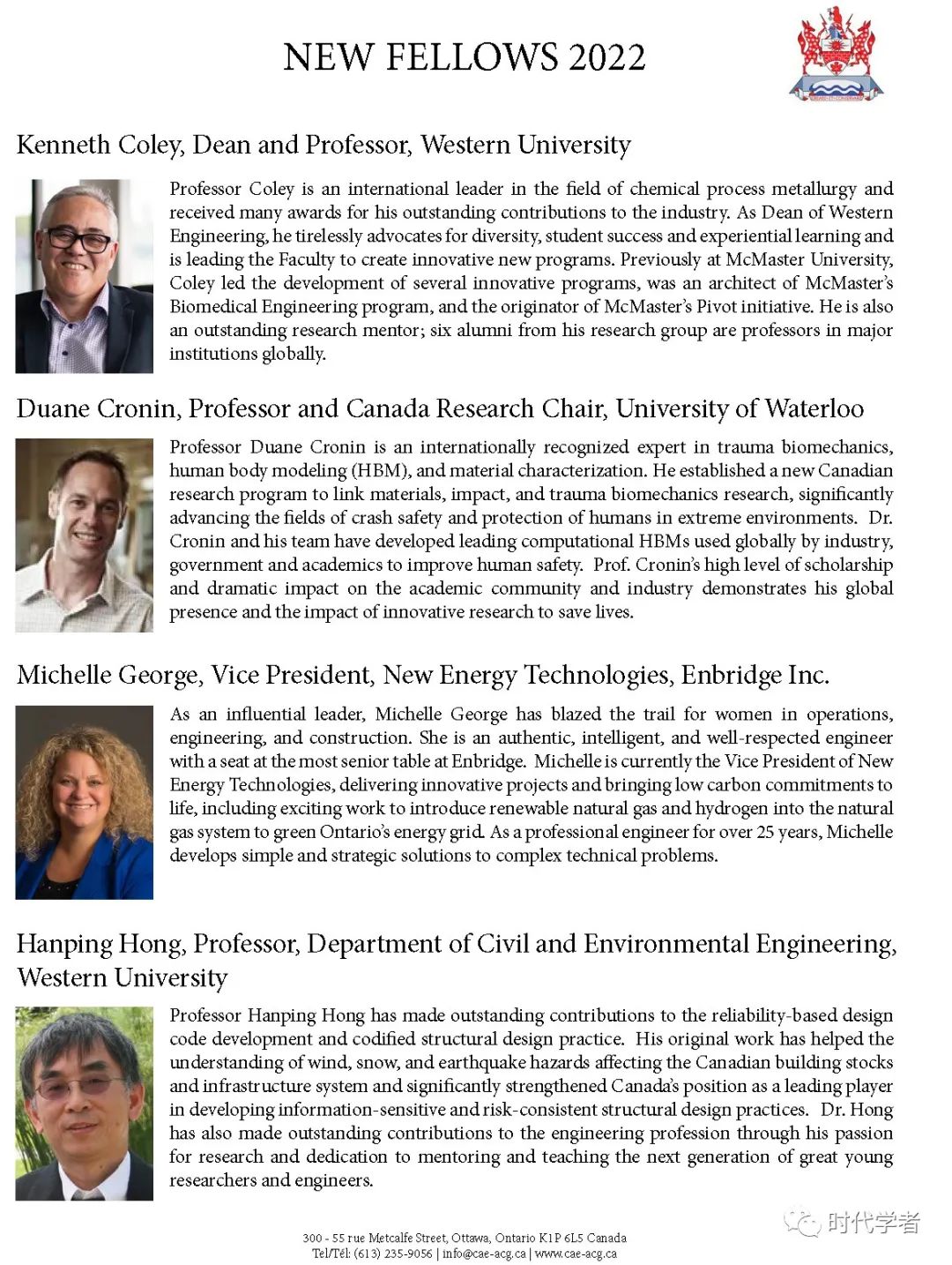 加拿大工程院(The Canadian Academy of Engineering)成立于1987年,是一个独立、自治的非盈利组织,入选人员由同行提名和选举产生,主要标准是参选者在研究领域的杰出成就和在工程专业上的长期服务。