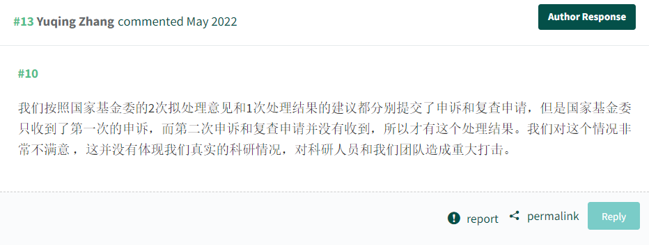 学术造假者对于自己的造假行为被处罚感到不满不是什么稀奇的事情。但是公开在pubpeer这样的国际性学术平台上表达对中国国家自然科学基金委员会处罚决定的不满,如此勇猛的行为小编是真的万万没想到。