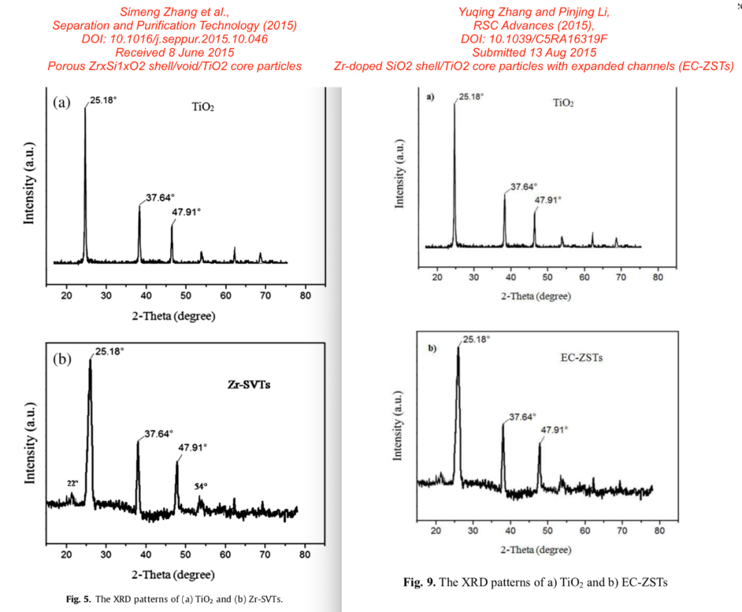 回复:两者论文似乎描述了不同的材料,其实它们具有相同的成分,但结构不同,即它们的分子通道不同。Li Pinjing的材料是多孔的掺杂了锆的二氧化硅外壳和二氧化钛内核的具有扩展通道的粒子,但张思萌的材料是多孔的锆硅二氧化物外壳和空隙与二氧化钛内核粒子,所以尽管它们的制备工艺不同,但是XRD的信息是相似的,因为两种材料的成分相同,只是结构不同。