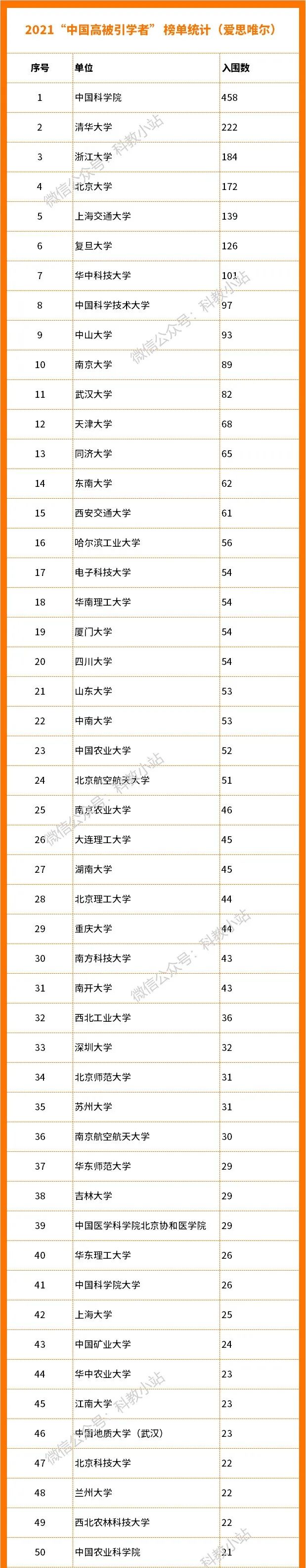 2021年中国高被引学者来自523所高校、企业和科研机构,中国科学院(其各科研院所合并同统计)拥有最多的高被引学者,共458位。清华222位,居第二位。浙江大学184位,居第三位。