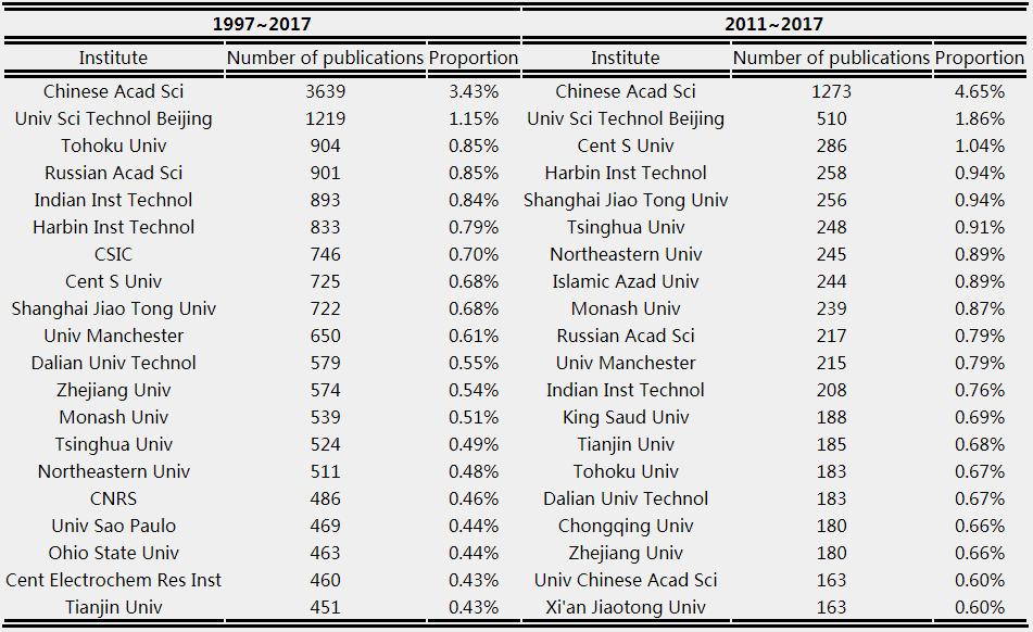 表6 1997~2017年间与2011~2017年间全球腐蚀与防护领域SCI-E文献输出量排名前20机构