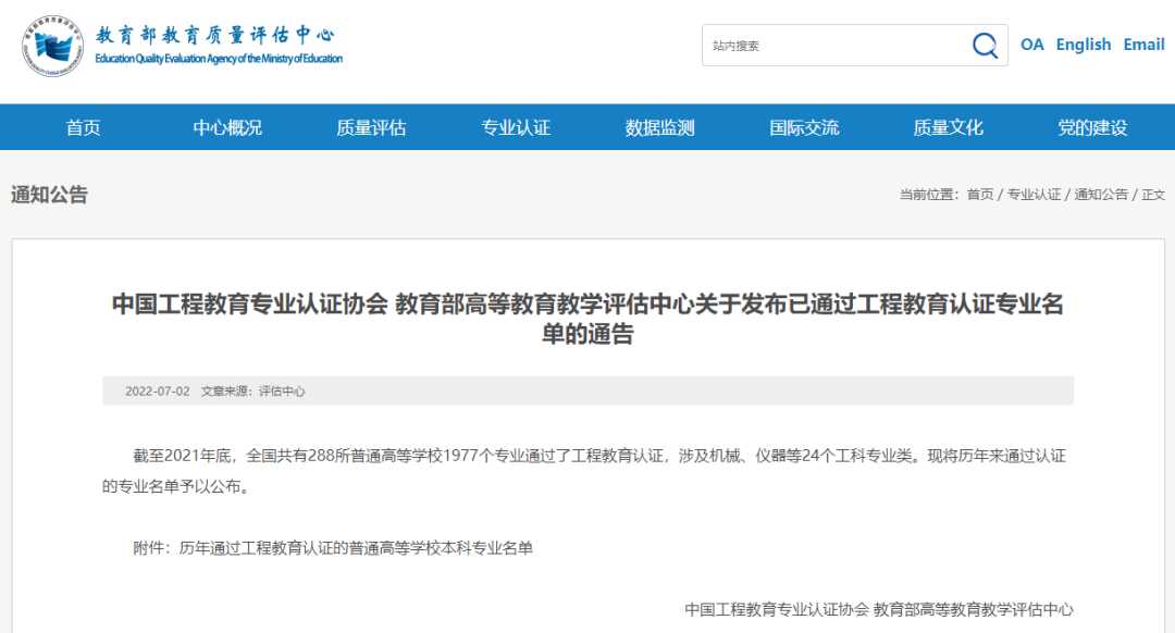 7月2日,中国工程教育专业认证协会、教育部教育质量评估中心发布已通过工程教育认证专业名单。截至2021年底,全国共有288所普通高等学校1977个专业通过了工程教育认证,涉及机械、仪器等24个工科专业类。