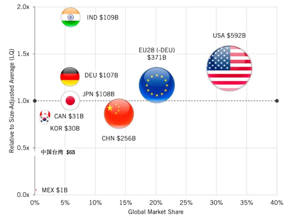 相对而言,中国台湾在该领域遥遥领先。截至2018年,中国台湾的产量几乎是调整后全球平均水平的9倍,这反映出台积电(TSMC)、联华电子(UMC)、联发科技(MediaTek)和宏基(Acer)等企业的全球领先地位。加拿大和印度在这一行业的专业程度最低(截至2018年,分别为全球平均水平的21%和27%),而欧盟28国(去除德国)的产量约为调整后全球平均水平的50%。