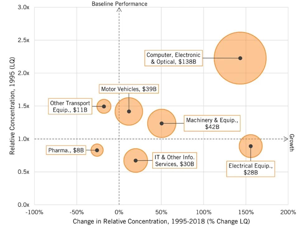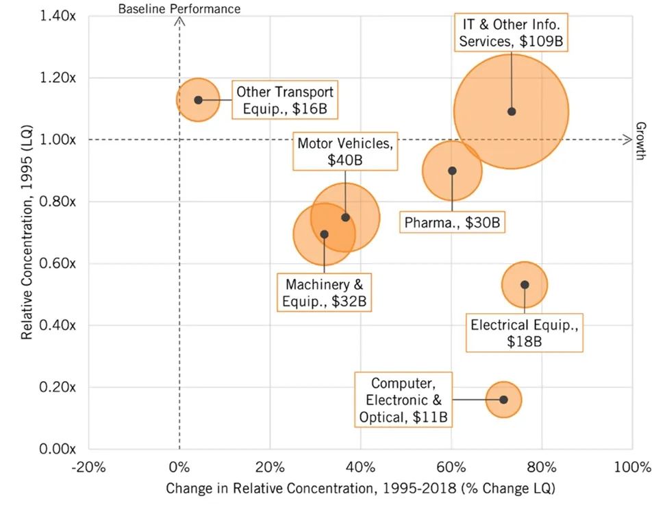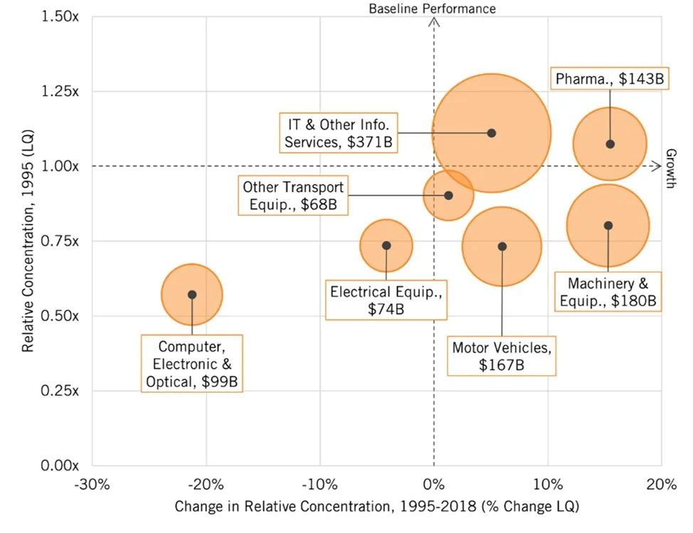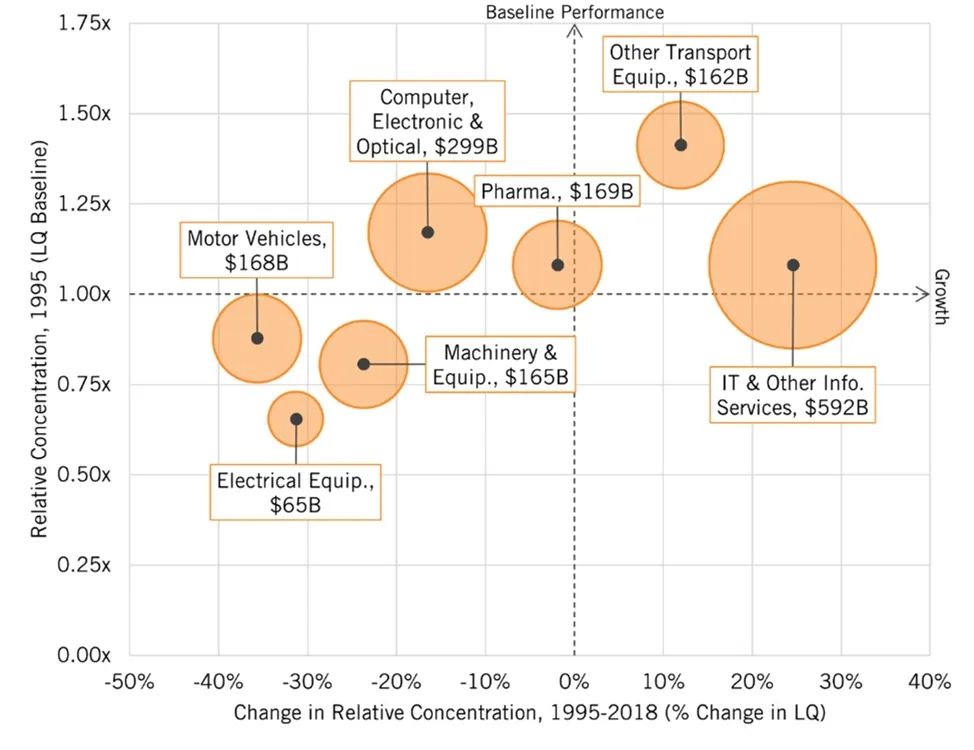 图9:1995-2018年美国经济中先进产业相对集中度的变化