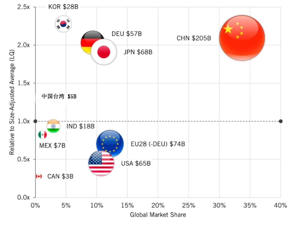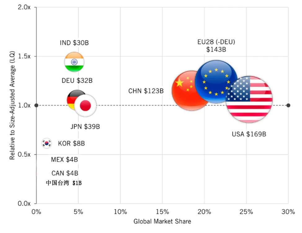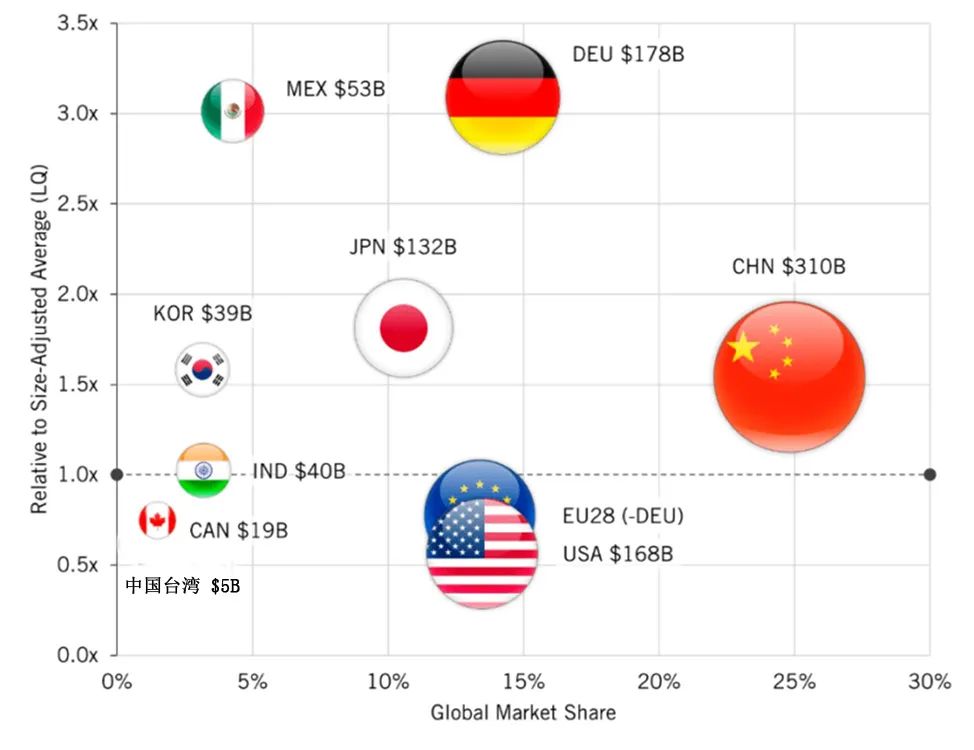 1995~2018年,中国的增长最为显著,其全球份额增长了近460%。印度也迅速增长,但基数很小。欧盟28国(去除德国)的全球份额从17%下降到13%。加拿大、日本和美国的份额也出现下跌——分别为59%、56%和38%。韩国、印度和墨西哥的份额有所增加,尽管起点较低。有趣的是,在北美贸易伙伴关系的背景下,加拿大和墨西哥的总份额增加了18%,但加拿大出现下降,墨西哥则有所上升。