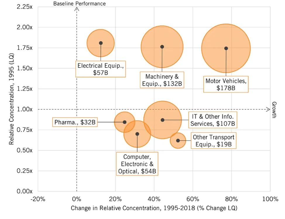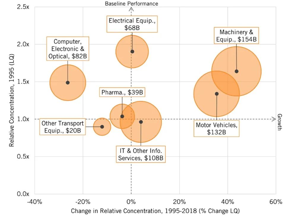 然而,当考虑到日本在全球经济中急剧萎缩的份额时,其先进制造业的表现却明显优于美国,集中度比美国高出50%以上,增加了其在机械设备和机动车辆方面的专业化。许多反对美国先进制造业战略的人士指出,日本在全球市场份额的丧失是产业战略注定要失败的证据。事实上,日本的先进制造业表现一直很稳定,而且其在日本经济中所占的份额明显高于美国。