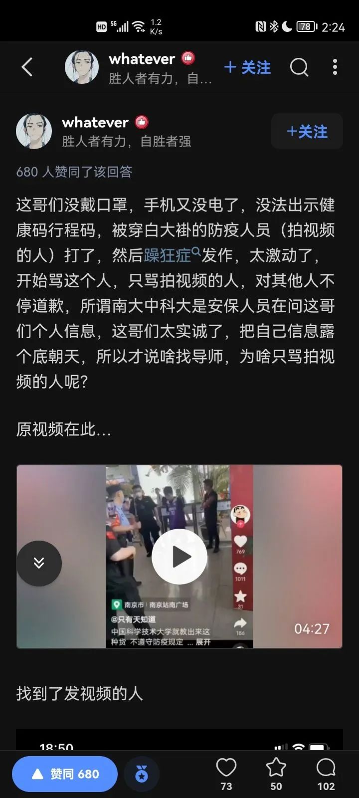 据知乎网友消息,该生没戴口罩,手机又没电了,没法出示健康码行程码,被穿白大褂的防疫人员(拍视频的人,志愿者,非医护人员)打了,然后躁狂症发作,太激动了,开始骂这个人,只骂拍视频的人,对其他人不停道歉,所谓南大中科大是安保人员在问这哥们个人信息,这哥们太实诚了,把自己信息露个底朝天,所以才说啥找导师。