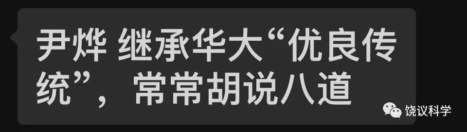 3)如果看了以上视频后继续认为尹烨没有问题,请不要与“饶议科学”的小编对话,因为后者只是义务维持公号,而他/她们没有义务、也没有能力改变任何人的智力。