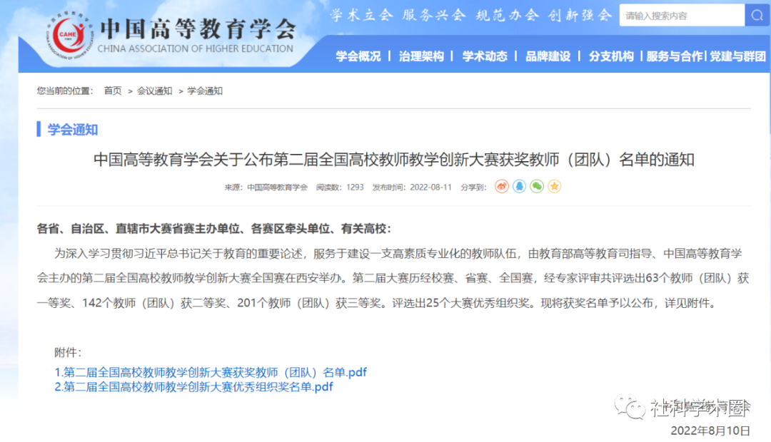 2022年8月10日,中国高等教育学会网站发布信息,公布了第二届全国高校教师教学创新大赛的获奖名单。