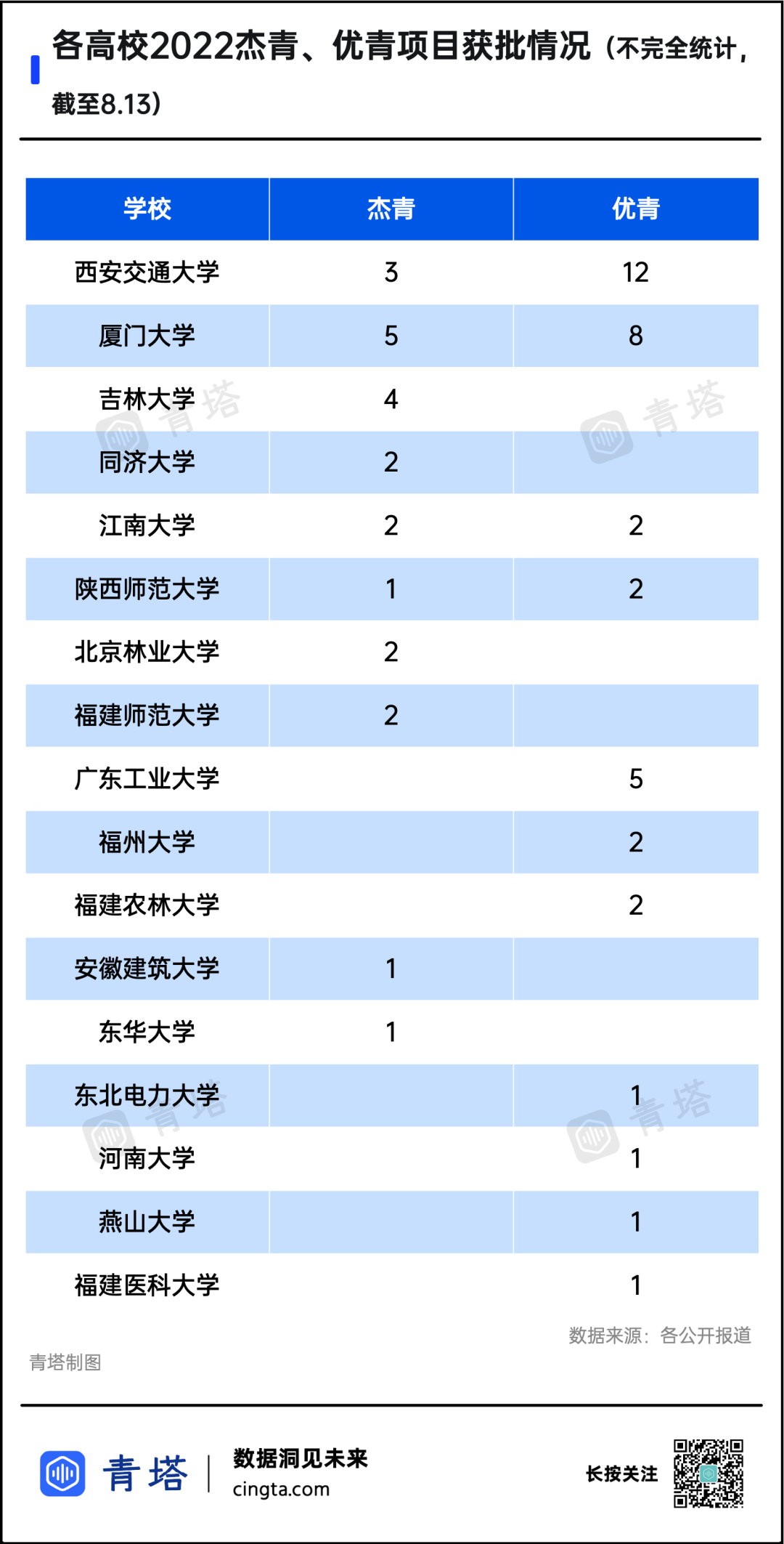不少高校已经陆续发布学校获批杰青、优青项目的喜讯。根据目前高校公开的消息显示,西安交通大学2022年获批了3项杰青项目和12项优青项目。厦门大学分别获批了5项杰青项目和8项优青项目。
