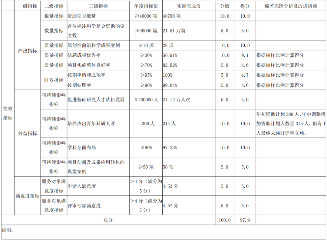 国家自然科学基金项目绩效自评综述:据年初设定的绩效目标,项目 绩效自评得分 97.9 分。项目全年预算数为 3,340,956.18 万元,执行数为 3,305,451.63 万元,完成预算的 98.9%。