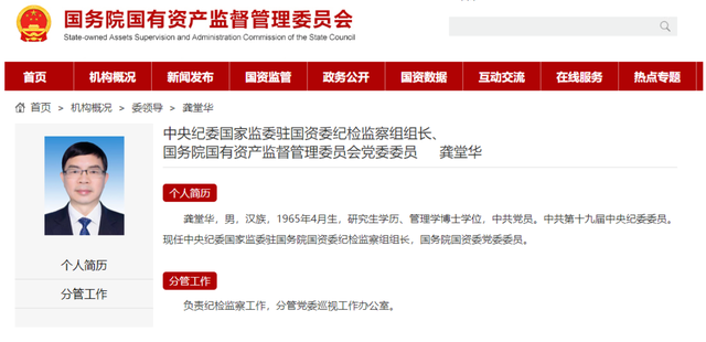 国务院国资委官方网站“委领导”栏目近日进行更新,据最新名单显示,龚堂华已任中央纪委国家监委驻国务院国资委纪检监察组组长,国务院国资委党委委员。