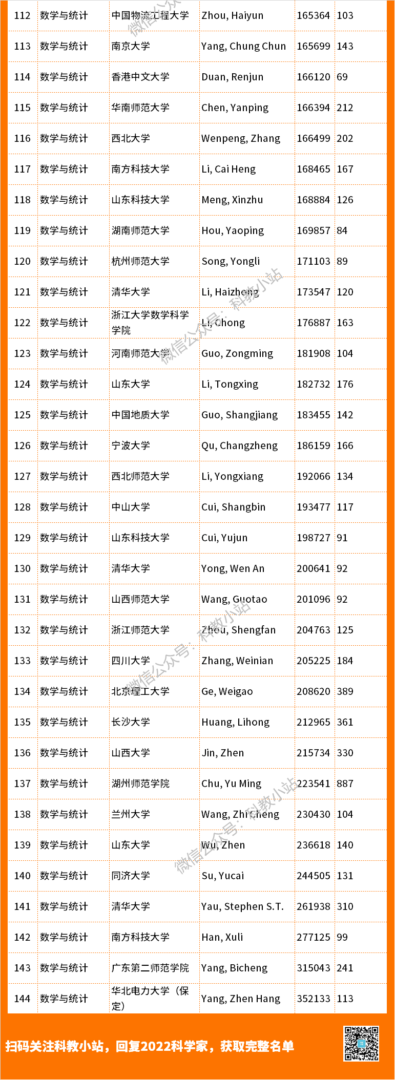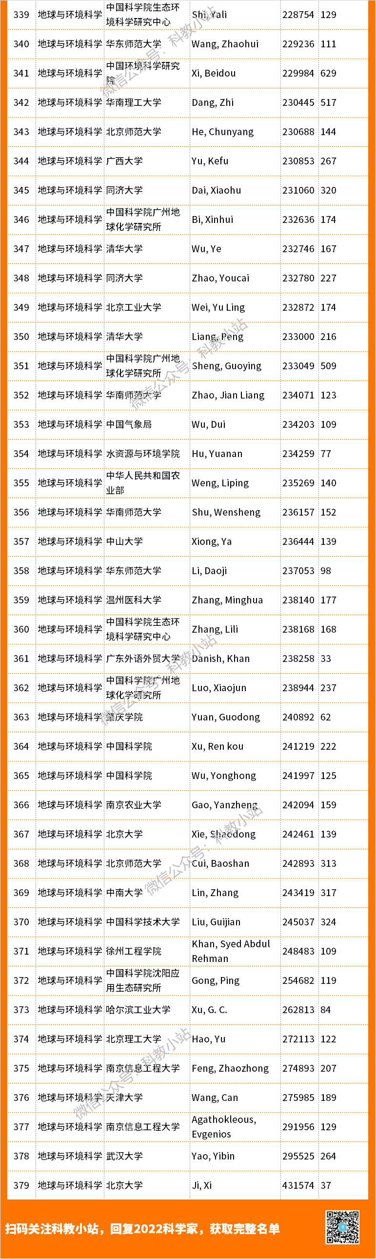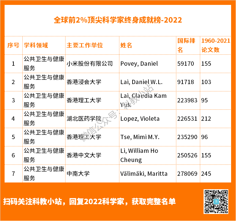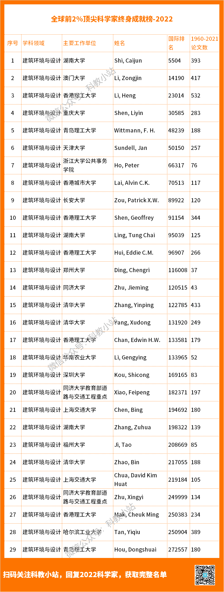 由于篇幅关系,今天仅列出国内学者的终身影响力排名情况,共有7795位国内学者入围全球前2%顶尖科学家-终身榜;