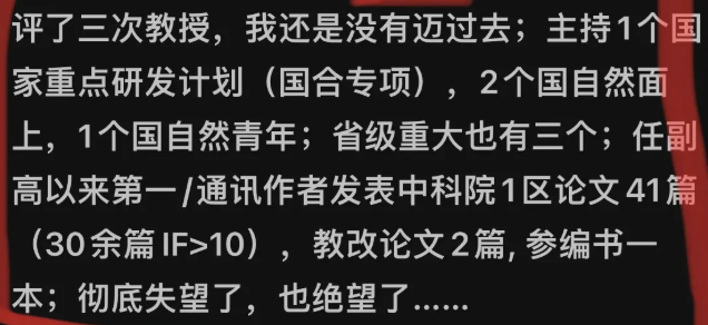 近日,一位高校教师在网络上分享自己评教授败北的经历:评了三次教授,还是没有迈过去。这位教师的工作经历包括:主持1个国家重点研发计划(国合专项),拿了2个国自然面上,1个国自然青年;省级重大三个……如此出色的条件,依旧未能评选上教授。不少网友感叹:“这些成果在绝大多数985可以评上教授了”“这个成绩可以在我们学校横着走。”