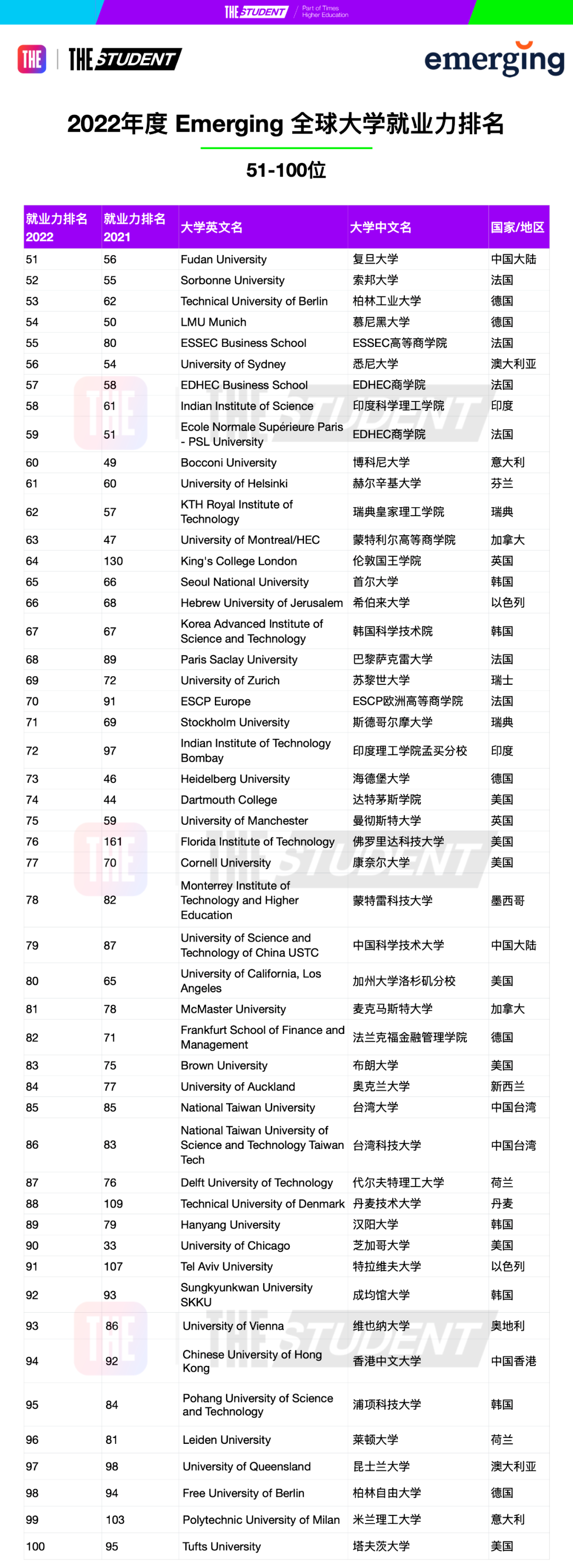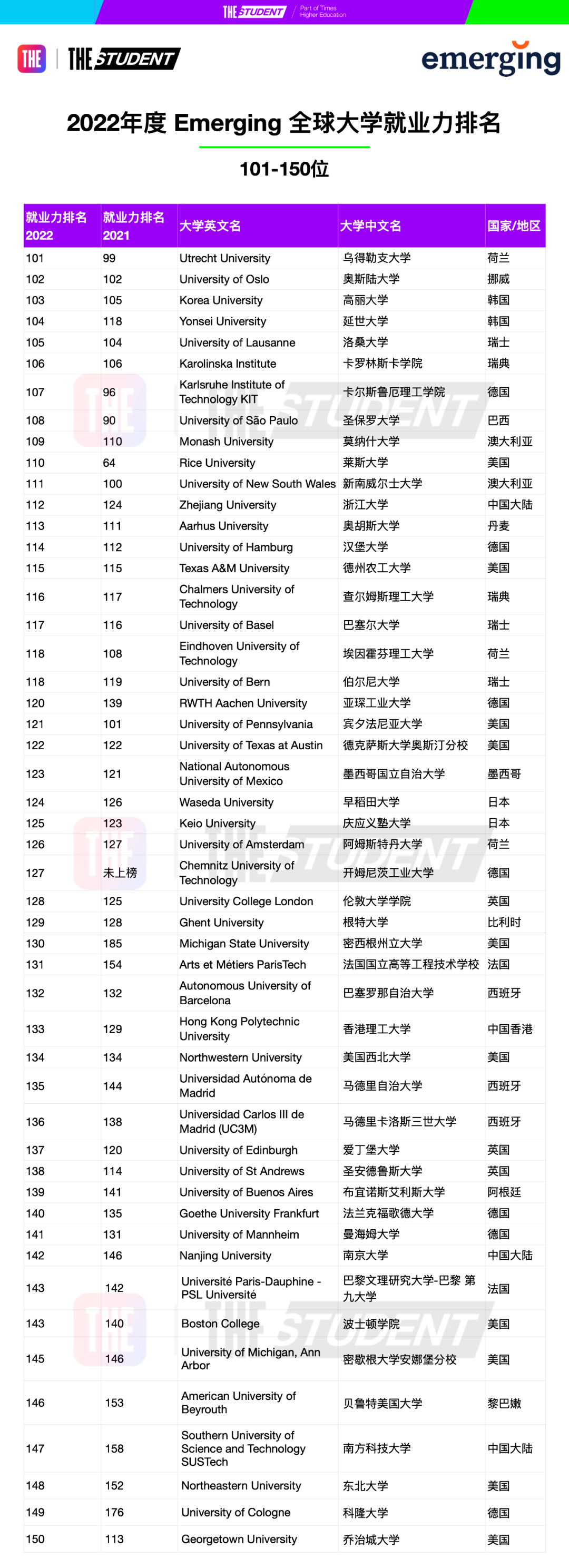 ▲2022年度全球大学就业力排名前10名,图源泰晤士高等教育