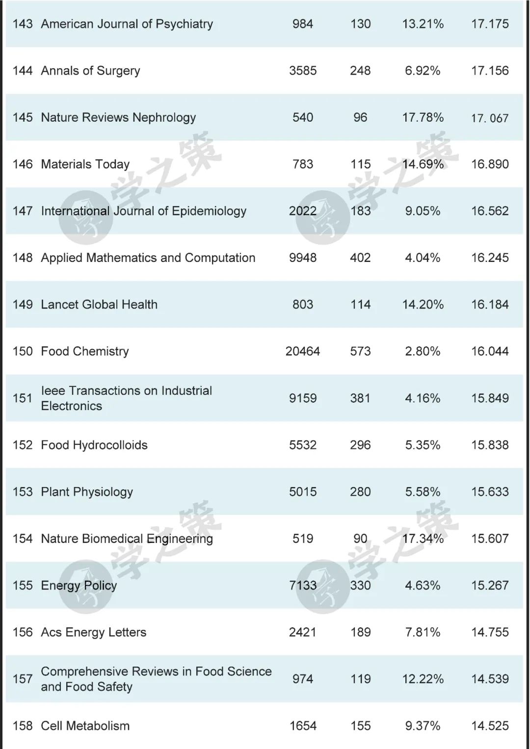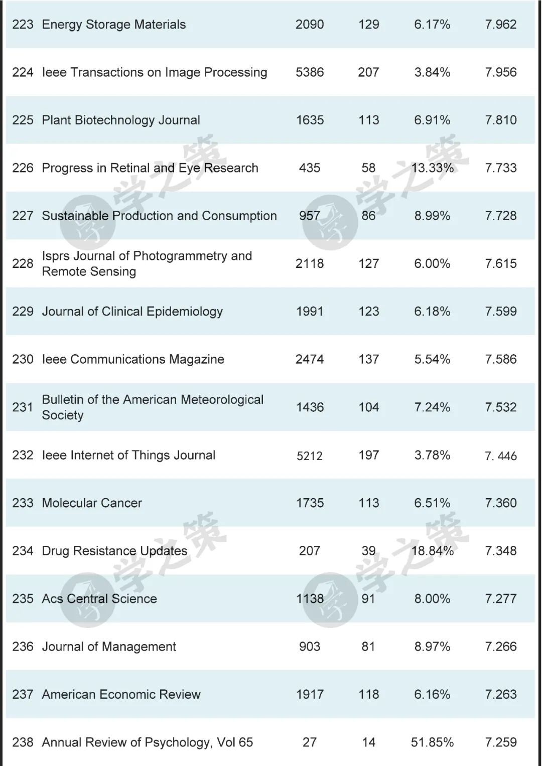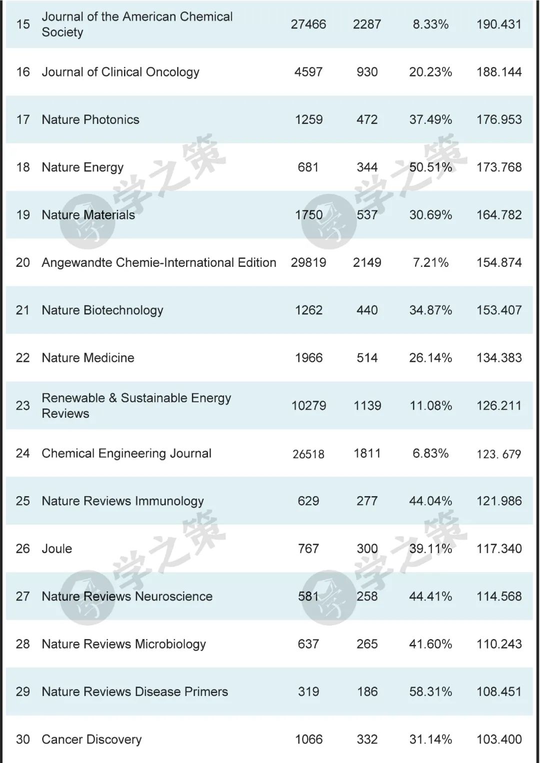 材料领域的顶级刊物Advanced Materials为第8位,Joule为第26位。