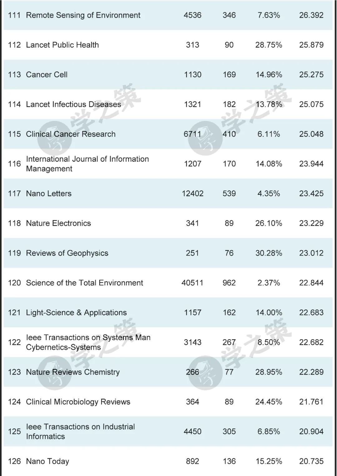 按照这种高被引指数,近万本期刊中,Nature排名第一,Science排名第二,这是符合常识的。和NS并称的Cell排名也不低,位列第14。